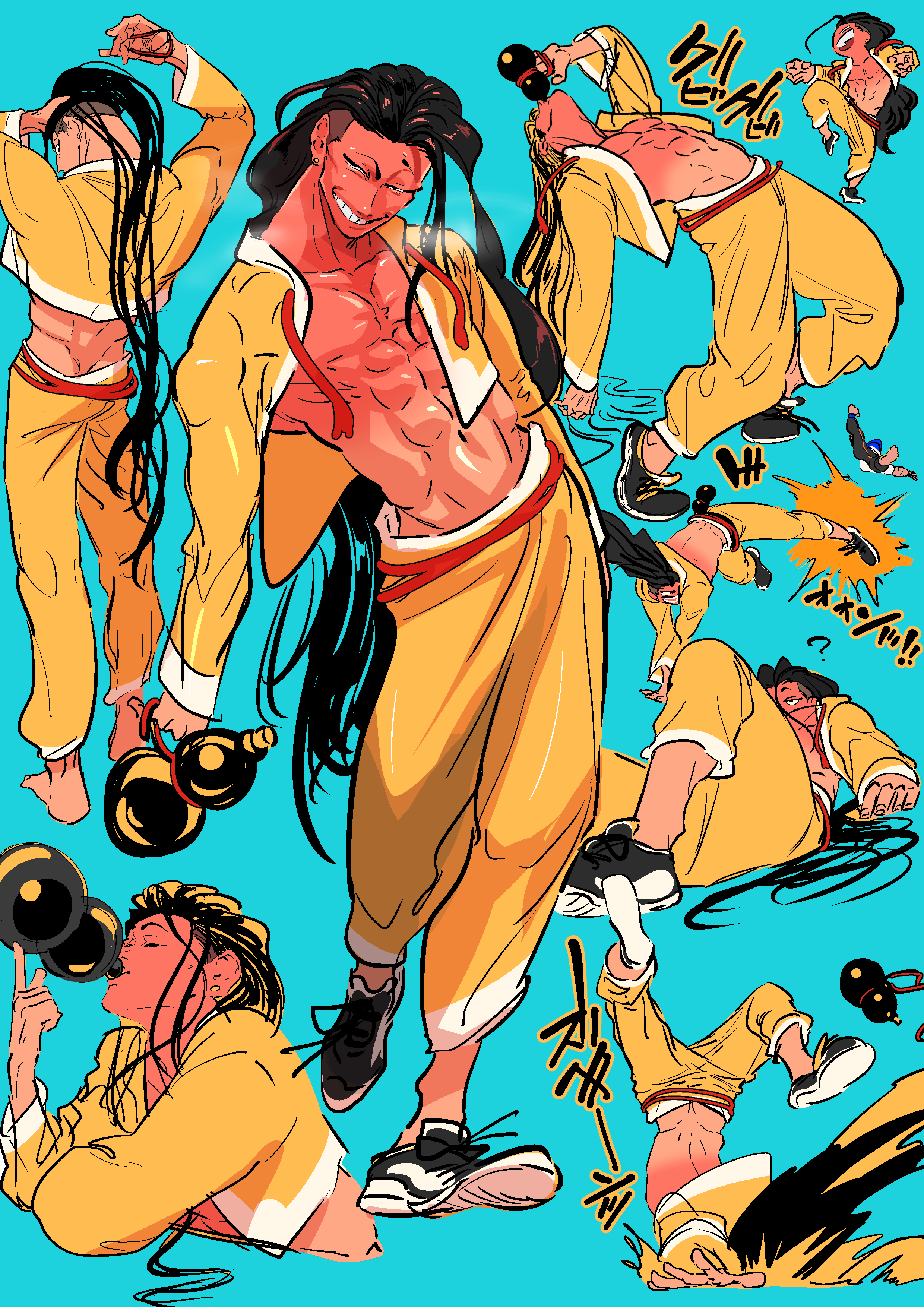1boy ? abs absurdres balancing barefoot black_footwear black_hair blue_background blush caxqov contrapposto cropped_jacket drunk ear_piercing fighting_stance full_body gourd grin half-closed_eyes hand_on_own_hip handstand highres hip_bones jacket jamie_siu kicking leg_up long_hair loose_hair_strand luke_sullivan male_focus open_mouth pants piercing shoes simple_background smile sneakers steam street_fighter street_fighter_6 tripping tying_hair undercut very_long_hair yellow_jacket yellow_pants
