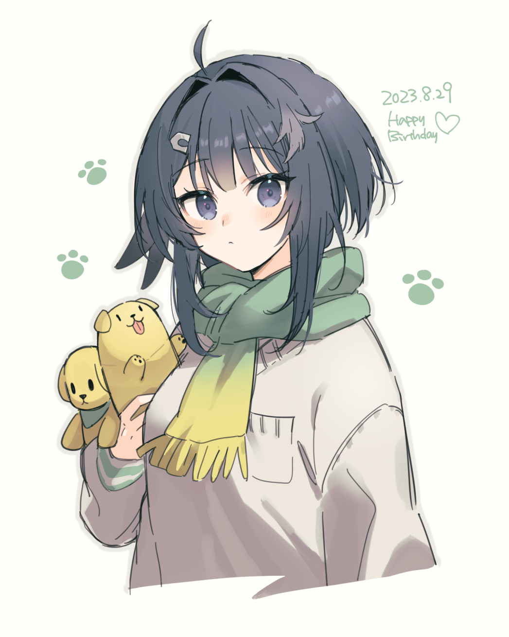 ahoge arknights black_hair breasts closed_mouth commentary cropped_torso dated fringe_trim gradient_scarf green_scarf hair_intakes hair_ornament hairclip happy_birthday highres la_pluma_(arknights) looking_at_viewer purple_eyes scarf simple_background small_breasts stuffed_animal stuffed_dog stuffed_toy sweater upper_body white_background white_sweater yellow_scarf yoshikichi