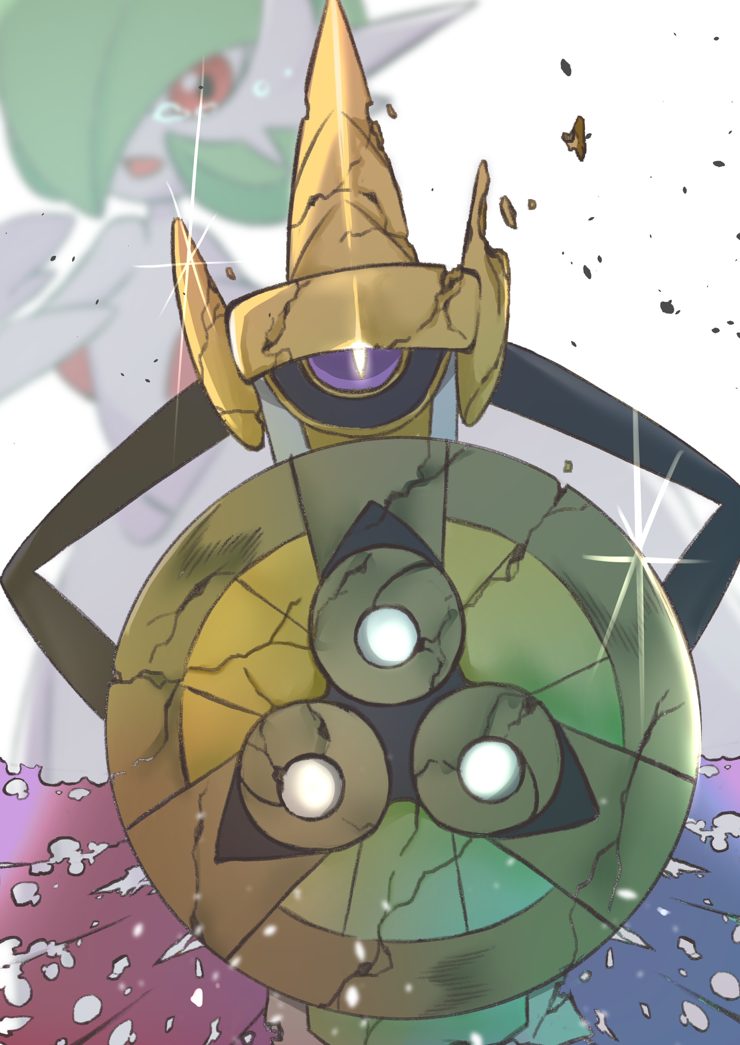 1girl absurdres aegislash black_sclera blurry blurry_background bright_pupils colored_sclera crack crying gardevoir gen_3_pokemon gen_6_pokemon glint glowing glowing_eyes highres kotomine_hisui looking_at_viewer mega_gardevoir mega_pokemon nintendo one-eyed pokemon pokemon_(creature) protecting purple_eyes shield solo_focus straight-on sword tears weapon white_background white_pupils
