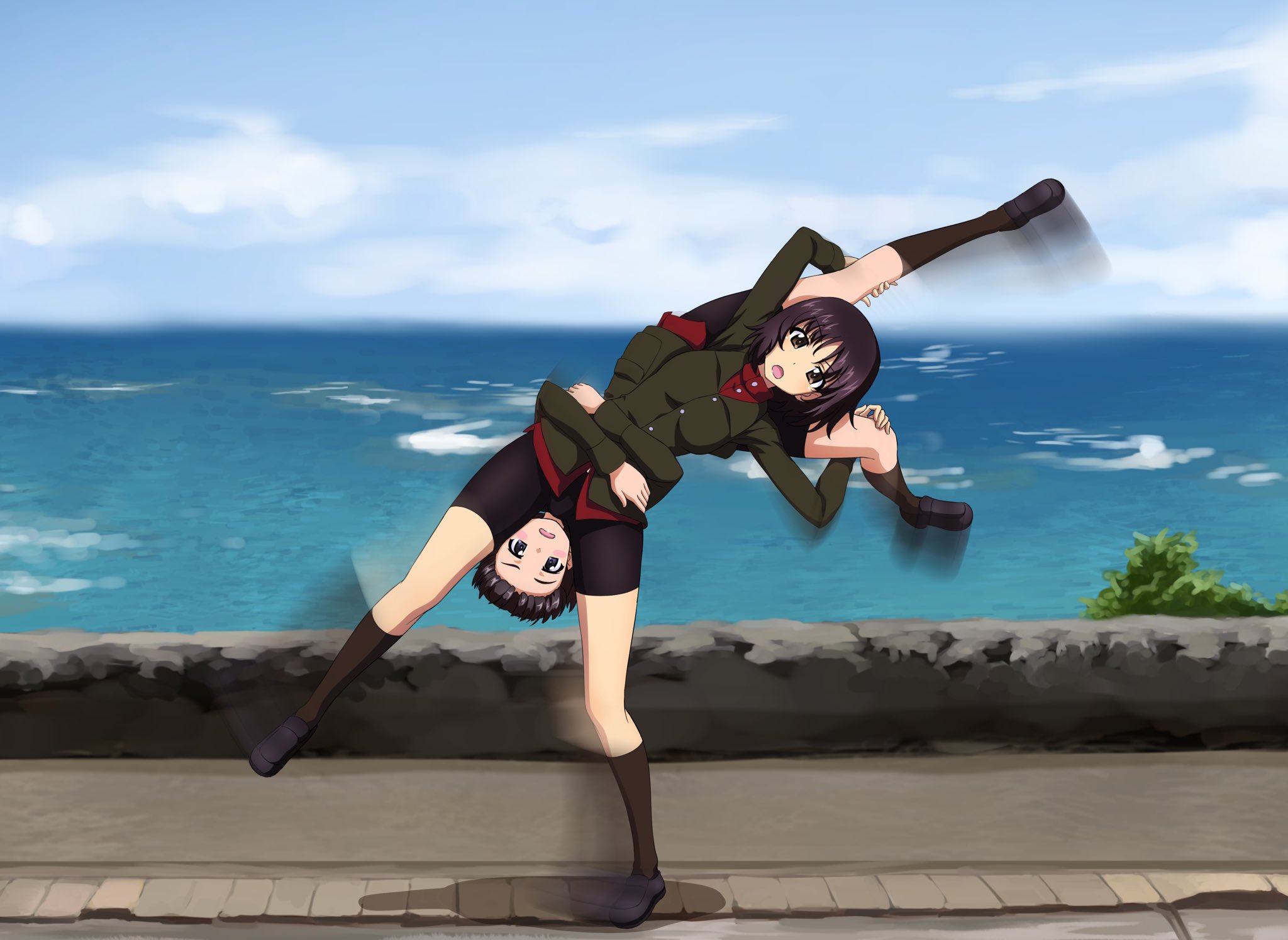 2girls alina_(girls_und_panzer) bike_shorts black_hair black_shorts blue_eyes blush breasts brown_eyes cartwheel girls_und_panzer highres key_(gaigaigai123) looking_at_viewer military_uniform multiple_girls nina_(girls_und_panzer) ocean open_mouth outdoors pravda_military_uniform short_hair shorts sky small_breasts