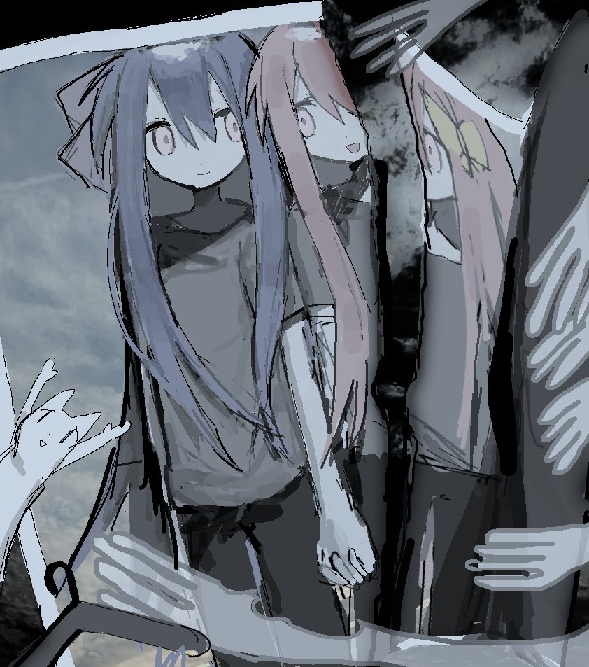2girls abstract_background alternate_costume black_pants blue_hair bow closed_mouth clothes_hanger colored_skin creature ghost ghost_hands grey_shirt grey_skin hair_bow holding_hands interlocked_fingers jaggy_lines kotonoha_akane kotonoha_aoi kurashi_gas_meter_(voiceroid) long_hair looking_at_another multiple_girls muted_color open_mouth pants photo_(object) pink_bow pink_eyes pink_hair shirt side-by-side sidelocks smile t-shirt toochi_(tochiko0214) torn_photo voiceroid yellow_bow