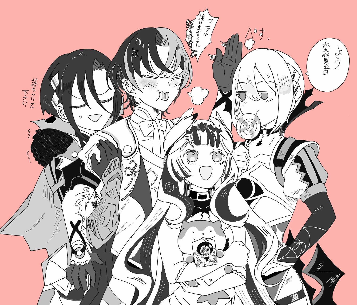 2boys 2girls male_alear_(fire_emblem) animal brother_and_sister candy closed_eyes fire_emblem fire_emblem_engage food half-closed_eyes highres holding holding_animal lollipop long_hair monochrome multicolored_hair multiple_boys multiple_girls nel_(fire_emblem) nil_(fire_emblem) nintendo open_mouth rafal_(fire_emblem) sasaki_(dkenpisss) short_hair siblings smile sommie_(fire_emblem) speech_bubble split-color_hair translation_request veyle_(fire_emblem) wavy_hair