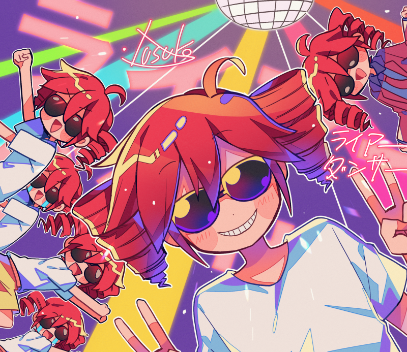 6+girls ahoge alternate_costume arms_up black_shirt blush_stickers clenched_hands clone collared_shirt commentary_request covered_eyes crying dancing disco_ball double_v drill_hair dual_persona facing_viewer formal_clothes grin jacket kasane_teto knee_up liar_dancer_(synthesizer_v) light_particles light_rays multiple_girls necktie purple_background raised_eyebrows red_hair red_jacket red_necktie red_suit shirt short_hair short_sleeves shorts smile song_name streaming_tears suit sunglasses t-shirt tears twin_drills utau v v-shaped_eyebrows white_shirt yellow_shorts yuusuke-kun