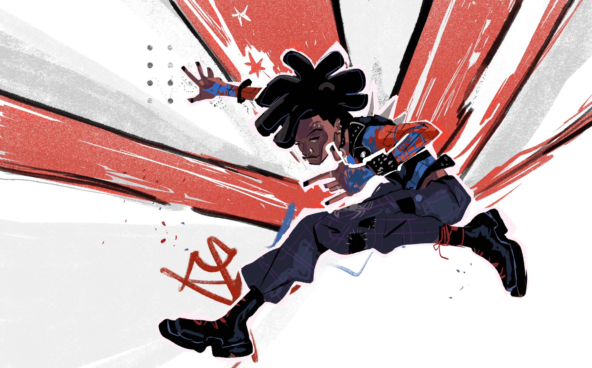 1boy black_hair boots dark_skin ear_piercing eyebrow_piercing face_piercing highres hobie_brown_(spider-punk) lip_piercing lip_ring marion_bordeyne marvel nose_piercing piercing smirk solo spider-man:_across_the_spider-verse spider-man_(series) spider-punk spider-verse spiked_jacket spiked_necklace very_dark_skin vest