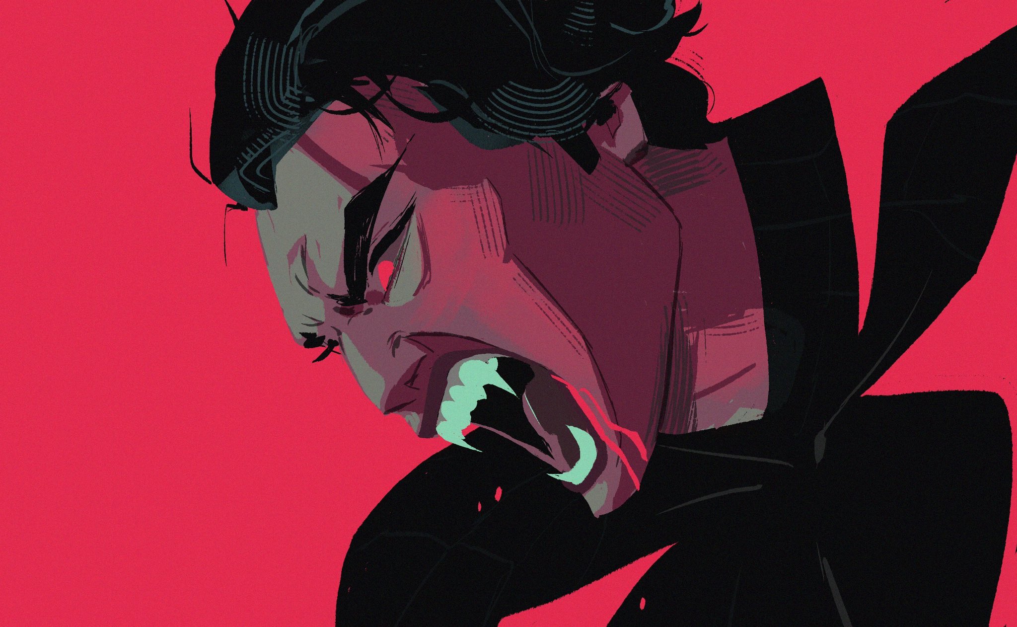 1boy black_bodysuit blood blood_on_face bodysuit dark-skinned_male dark_skin fangs glowing glowing_eyes hair_slicked_back highres male_focus marion_bordeyne marvel miguel_o'hara multicolored_bodysuit open_mouth red_background red_bodysuit red_eyes solo spider-man:_across_the_spider-verse spider-man_(2099) spider-man_(series) spider-verse two-tone_bodysuit