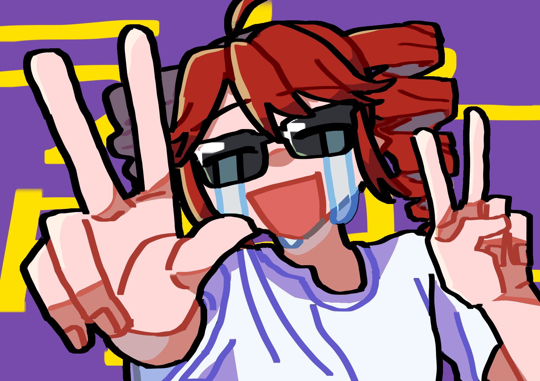 1girl ahoge alternate_costume closed_mouth commentary_request crying drill_hair facing_viewer hand_up happy_tears highres kasane_teto liar_dancer_(synthesizer_v) ogura_tsutsumi open_mouth outstretched_arm purple_background red_hair shirt short_sleeves smile solo streaming_tears sunglasses t-shirt tears text_background twin_drills upper_body utau v w white_shirt