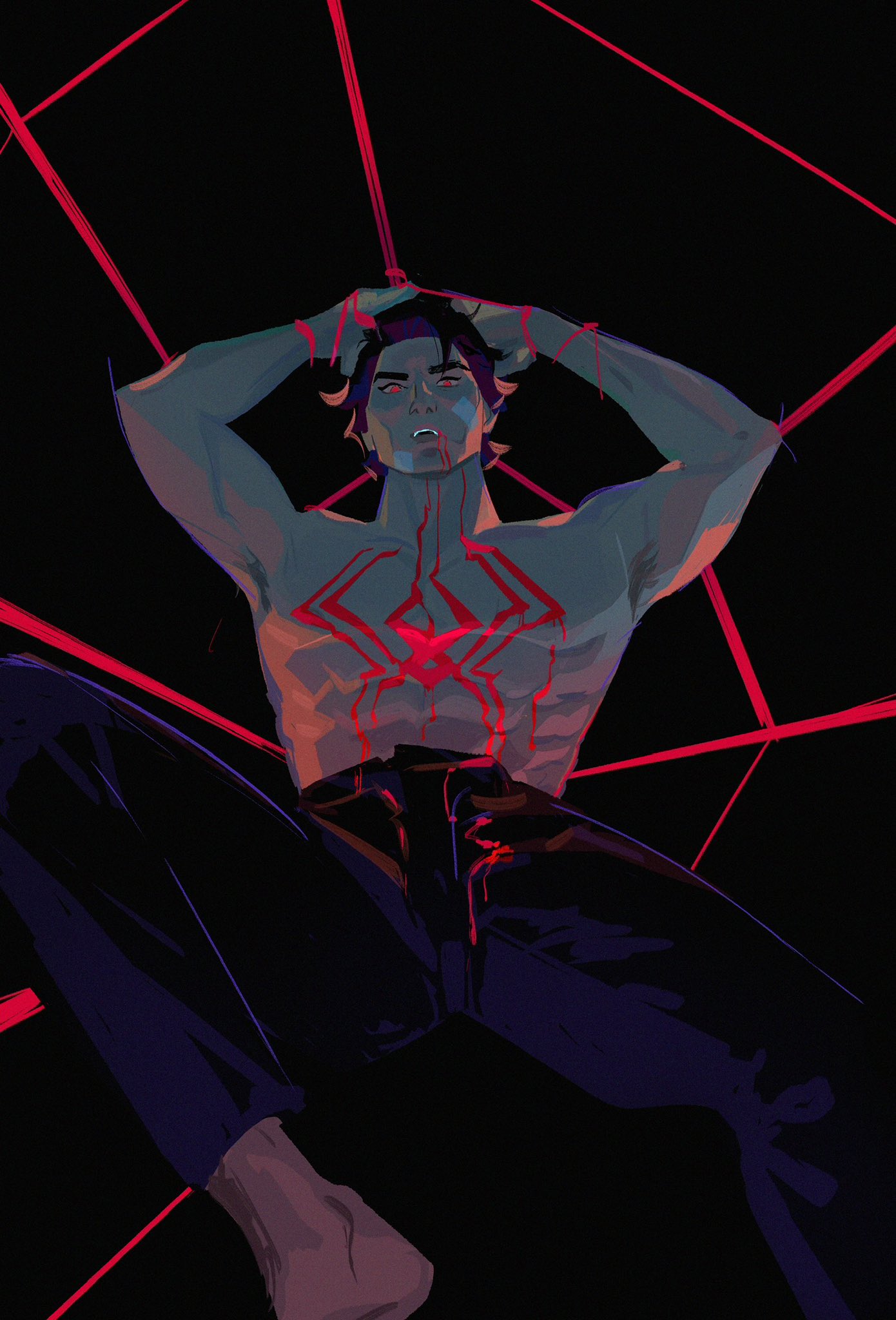 1boy armpit_hair arms_behind_head arms_up barefoot black_hair blood blood_in_mouth blood_on_chest blood_on_clothes blue_hair bound fangs glowing glowing_eyes highres marion_bordeyne marvel miguel_o'hara pants red_eyes silk solo spider-man:_across_the_spider-verse spider-man_(series) spider-verse spider_web spread_legs tied_up_(nonsexual) topless_male