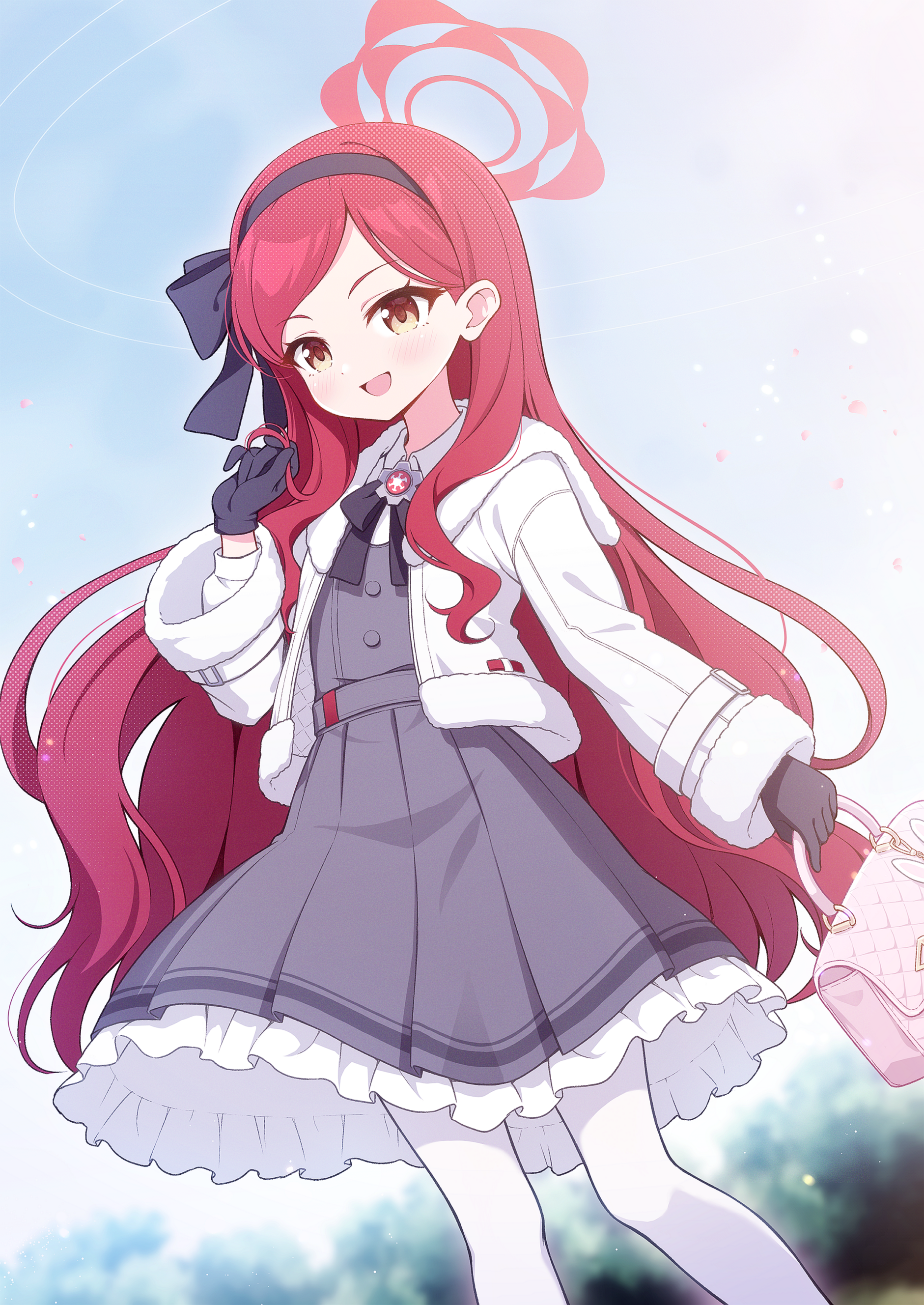1girl :d absurdres black_bow black_bowtie black_gloves blue_archive blue_sky blurry bow bowtie cloud cloudy_sky commentary_request depth_of_field dress forehead fur-trimmed_jacket fur_trim gloves hairband halo highres jacket long_hair long_sleeves looking_at_viewer open_clothes open_jacket open_mouth outdoors parted_bangs pinafore_dress pleated_skirt red_hair school_uniform sidelocks skirt sky sleeveless sleeveless_dress smile solo takane_(blue_archive) white_jacket wodaex yellow_eyes