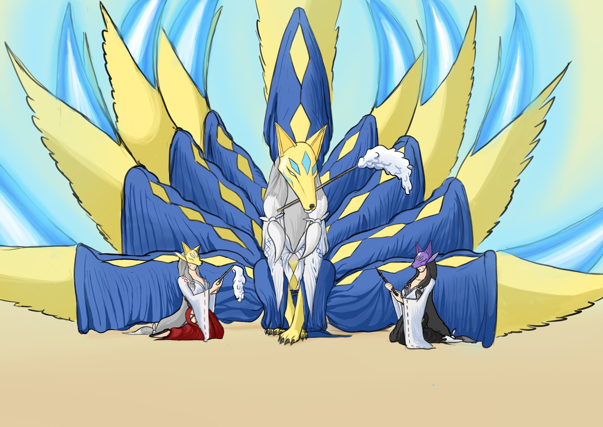 armor digimon digimon_(creature) highres kitsune kuzuhamon kuzuhamon_miko_mode kyuubi multiple_tails original sakuyamon sakuyamon_miko_mode tail yin_yang