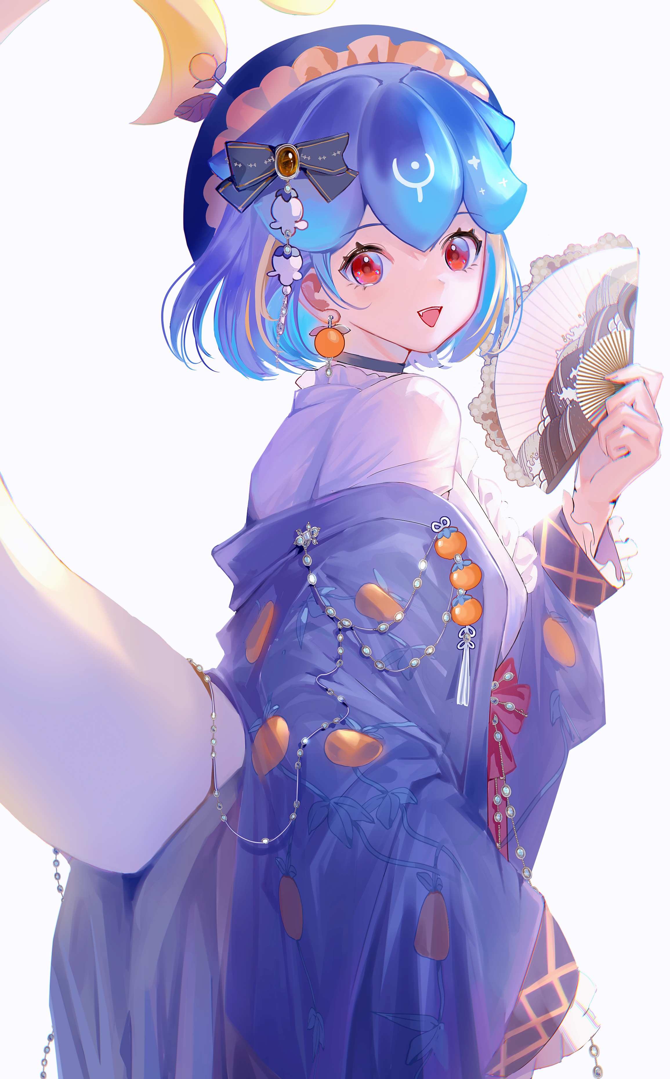 1girl absurdres alternate_costume bao_the_whale beret black_choker blonde_hair blue_bow blue_hair blue_hat blue_jacket bow breasts choker earrings hair_bow hand_fan hat highres holding holding_fan indie_virtual_youtuber jacket jewelry long_sleeves medium_breasts multicolored_hair off_shoulder open_mouth red_eyes shan_lan shirt sleeves_past_wrists smile solo streaked_hair tail virtual_youtuber white_background white_shirt