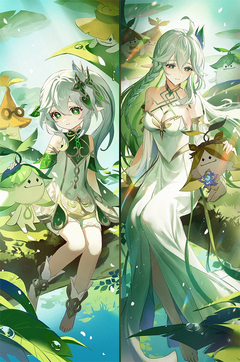 0jae 2girls 6+others ahoge animal_ears aranara_(genshin_impact) bare_shoulders barefoot bloomers blue_flower blue_sky bow bracelet braid breasts brown_bow brown_headwear closed_mouth colored_inner_hair colored_skin cross-shaped_pupils day detached_sleeves dress flower gem genshin_impact gold_bracelet gold_trim gradient_hair grass green_eyes green_gem green_headwear green_skin grey_hair hair_between_eyes hair_ornament hand_on_another's_head hand_up heart heart_hair_ornament highres holding holding_flower jewelry leaf leaf_hair_ornament long_hair long_sleeves looking_at_another lying medium_breasts multicolored_hair multiple_girls multiple_others nahida_(genshin_impact) neck_ring on_back outdoors pointy_ears ponytail purple_flower rukkhadevata_(genshin_impact) short_sleeves side_ponytail sidelocks sitting sky smile standing sunlight symbol-shaped_pupils underwear water water_drop white_bloomers white_dress wide_sleeves yellow_headwear yellow_skin
