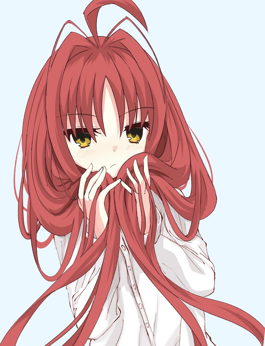1girl ahoge blush bububugsan closed_mouth commentary dracu-riot! dress_shirt eyelashes frown grey_background hair_between_eyes hair_intakes hand_in_own_hair hands_up highres holding holding_own_hair jitome long_hair long_sleeves looking_at_viewer red_hair shirt simple_background solo upper_body very_long_hair white_shirt yarai_miu yellow_eyes
