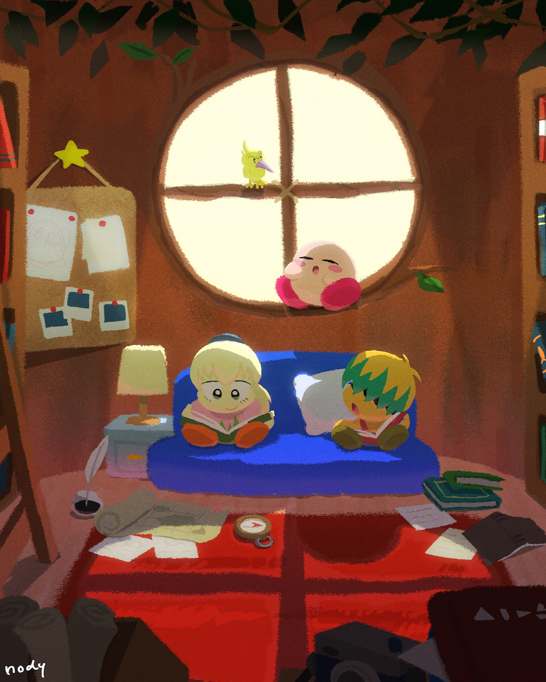 :o artist_name bird blonde_hair blush blush_stickers book bookshelf box brother_and_sister bulletin_board bun_(kirby) camera cardboard_box closed_eyes closed_mouth commentary_request compass couch desk_lamp fumu_(kirby) green_eyes green_hair hair_over_eyes highres holding holding_book indoors inkwell kirby kirby:_right_back_at_ya! kirby_(series) ladder lamp leaf long_hair map multicolored_hair nintendo nody_(nody_lowmoo) on_couch open_book open_mouth paper photo_(object) pillow plant quill reading round_window rug scroll shadow short_hair siblings sitting sleeping smile star_(symbol) table tokkori_(kirby) vines window