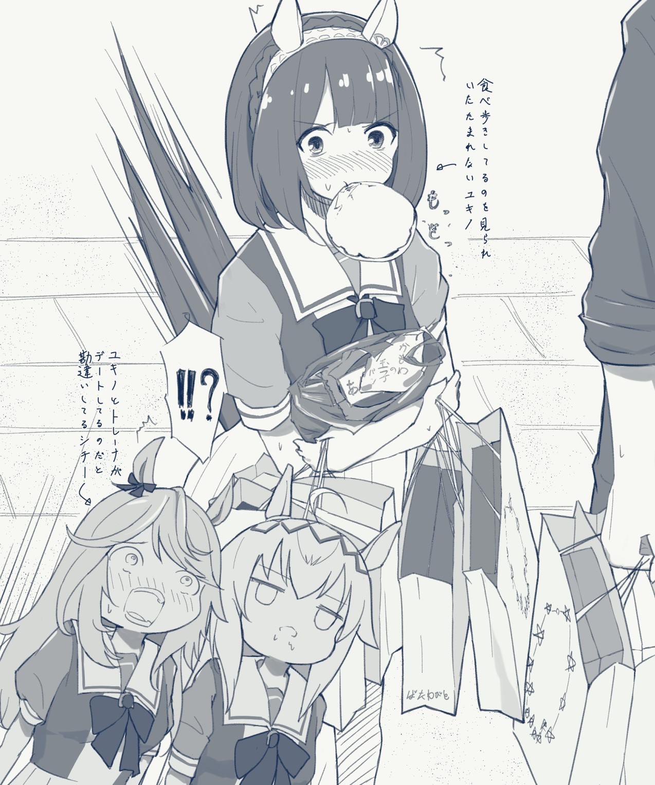 !? 1boy 3girls animal_ears bag blush butterwabito commentary_request food_in_mouth gold_city_(umamusume) headband highres horse_ears horse_girl horse_tail long_hair looking_at_viewer medium_hair monochrome multiple_girls oguri_cap_(umamusume) paper_bag saliva school_uniform surprised tail tracen_school_uniform trainer_(umamusume) translation_request umamusume yukino_bijin_(umamusume)