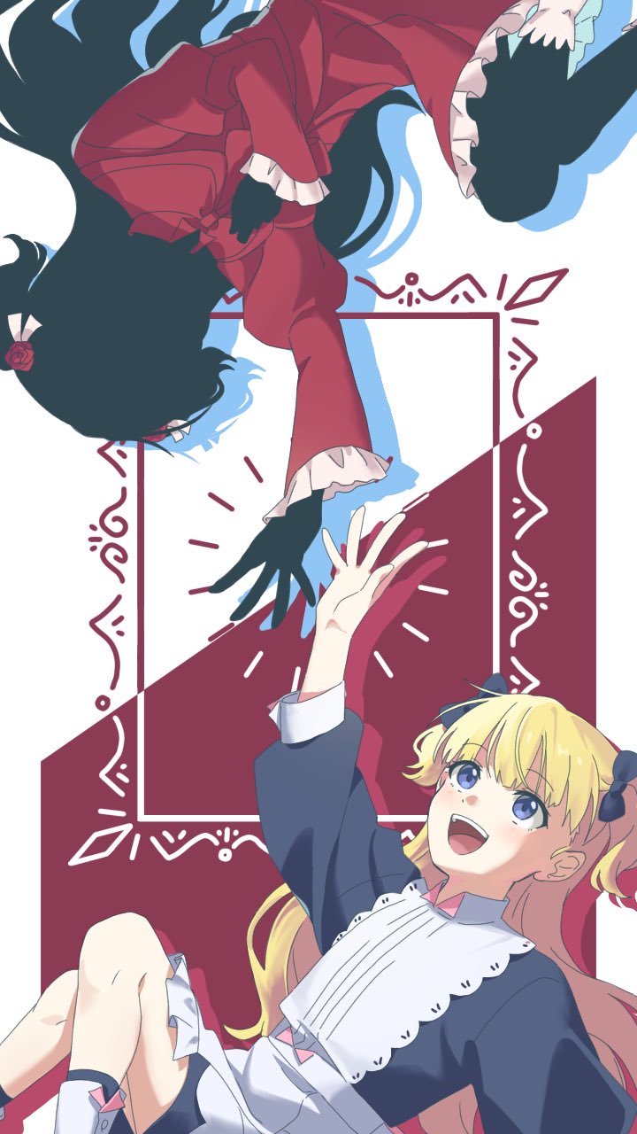 2girls :d apron black_hair black_skin blonde_hair blue_bow blue_dress blue_eyes blue_socks blunt_bangs bow colored_skin commentary_request dress drop_shadow emilico_(shadows_house) flower hair_bow hair_flower hair_ornament high_five highres kate_(shadows_house) knees_up kurii_(yhnfj6itvd9467o) living_doll_uniform long_hair long_sleeves looking_at_another looking_up multiple_girls open_mouth puffy_sleeves red_dress red_flower red_rose rose rotational_symmetry shadow_(shadows_house) shadows_house sitting smile socks two_side_up upside-down white_apron white_footwear
