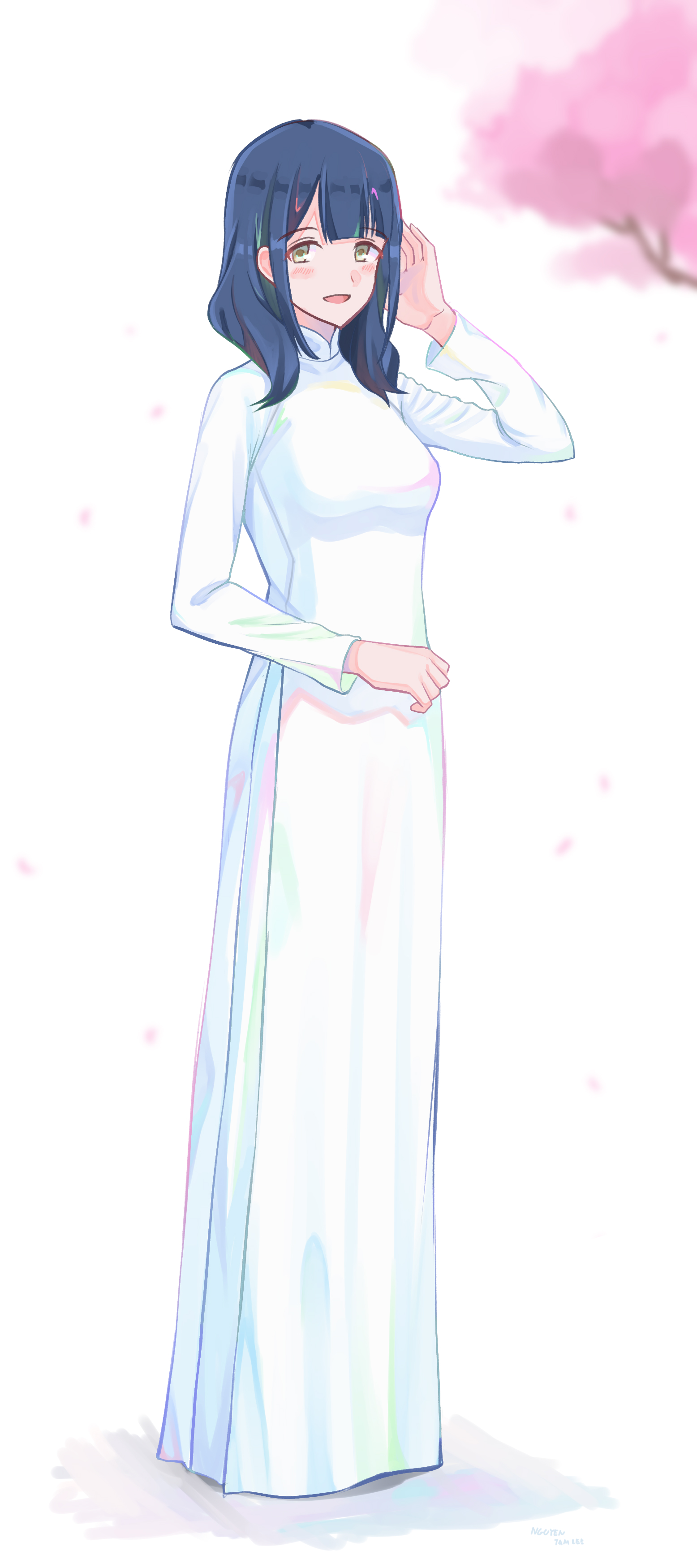 1girl absurdres blue_hair blush cherry_blossoms falling_petals hanayagi_kaoruko highres nguyen_tam_lee open_mouth pants petals shoujo_kageki_revue_starlight smile tree vietnamese_clothes ao_dai white_pants yellow_eyes