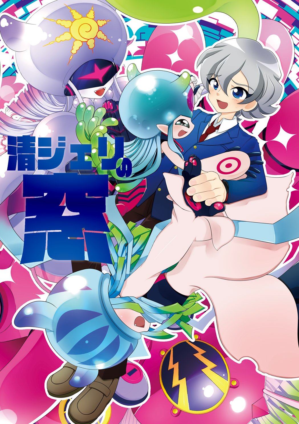 amphimon android armor bandaged_arm bandages blue_eyes couple digimon digimon_(creature) digimon_ghost_game diving_suit full_armor gynoid higashimitarai_kiyoshiro highres hug jellyfish_girl jellymon mask mecha_girl monster_girl multiple_persona no_eyes robot_girl short_hair tentacle_hair tentacles teslajellymon thetismon translation_request white_hair