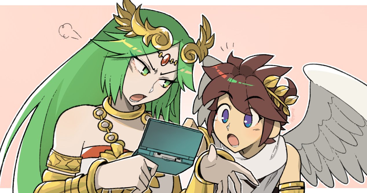 1boy 1girl ancient_greek_clothes angel angel_wings armlet blue_eyes blushily border brown_hair chiton derivative_work forehead_jewel greco-roman_clothes green_eyes green_hair handheld_game_console holding holding_handheld_game_console jewelry kid_icarus kid_icarus_uprising laurel_crown long_hair looking_at_another nintendo nintendo_3ds open_mouth outside_border palutena pit_(kid_icarus) screenshot_redraw upper_body v-shaped_eyebrows white_border wings
