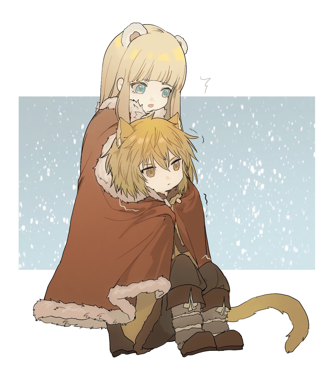 2boys androgynous animal_ears bear_ears blonde_hair blue_eyes blunt_bangs boots brown_eyes canute cat_ears cat_tail chibi cloak closed_mouth cold fur_trim highres male_focus messy_hair motion_lines multiple_boys open_mouth outdoors prince red_cloak sidelocks sitting snow snowing tail thorfinn viking vinland_saga yuxi_gyuan