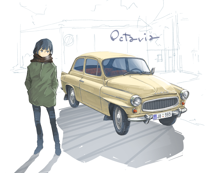 1girl black_eyes black_hair black_pants blush_stickers breath car commentary_request green_jacket jacket jettoburikku license_plate looking_at_object motor_vehicle original pants scarf shadow sketch_background skoda skoda_octavia solo vehicle_focus vehicle_name
