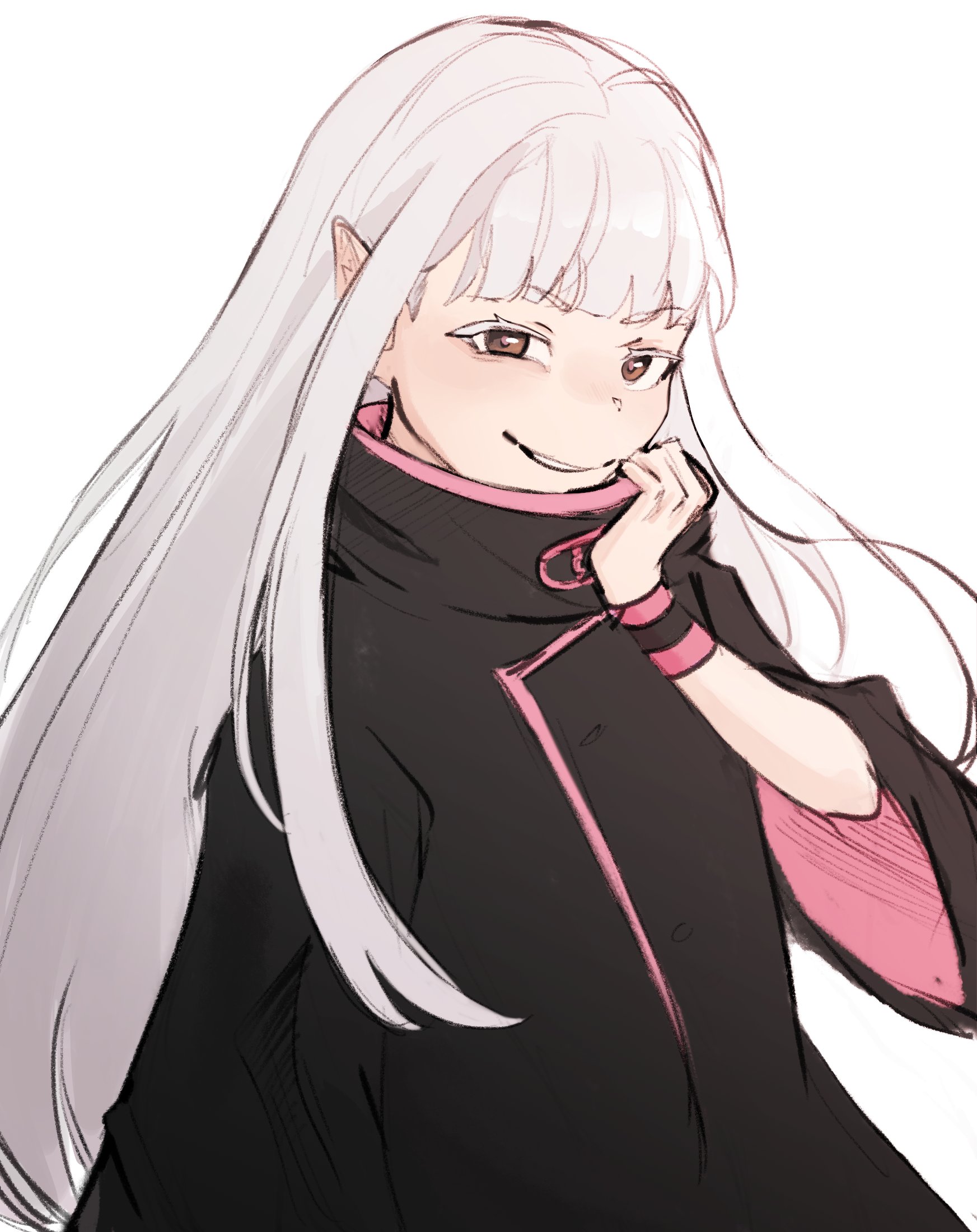 1girl black_robe brown_hair child echidna_(re:zero) elf highres long_hair looking_at_viewer omega_(re:zero) pointy_ears re:zero_kara_hajimeru_isekai_seikatsu robe very_long_hair white_hair