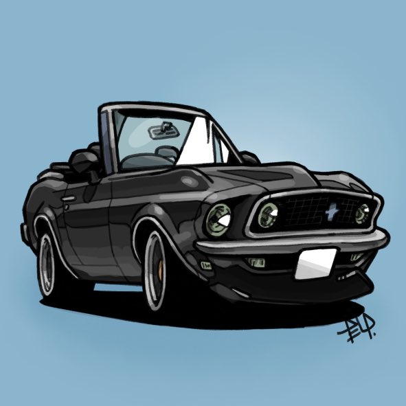 blue_background car chibi convertible ford ford_mustang ford_mustang_(1st_generation) motor_vehicle muscle_car no_humans original shadow signature simple_background takedake_(motion_animator) vehicle_focus