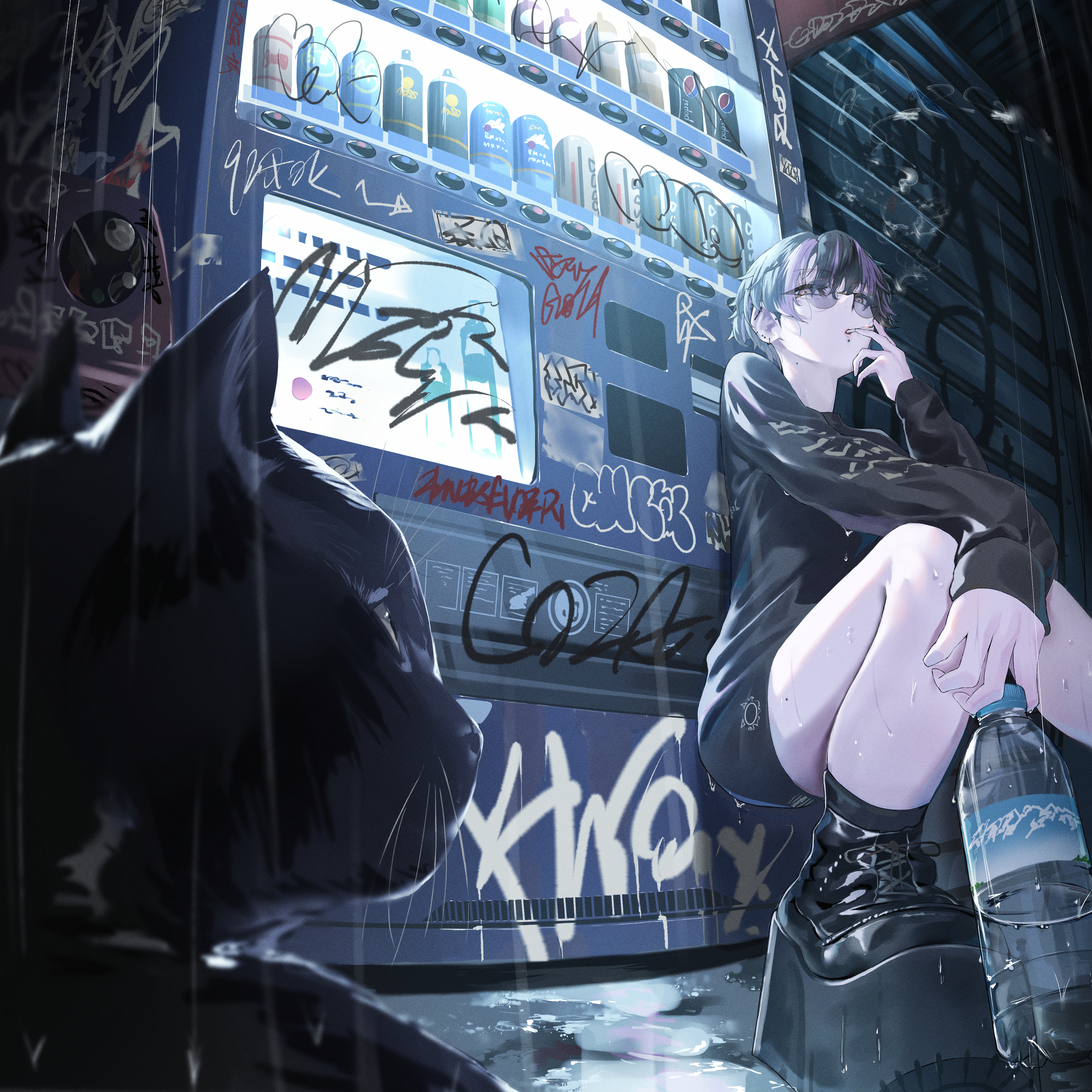 1girl absurdres akiaki_aki black_cat black_hair black_shorts black_sweater boots bottle can cat drink_can ear_piercing from_below graffiti highres multicolored_hair original outdoors piercing platform_boots platform_footwear purple_hair rain short_hair shorts smoking soda_can solo squatting streaked_hair sweater vending_machine water_bottle