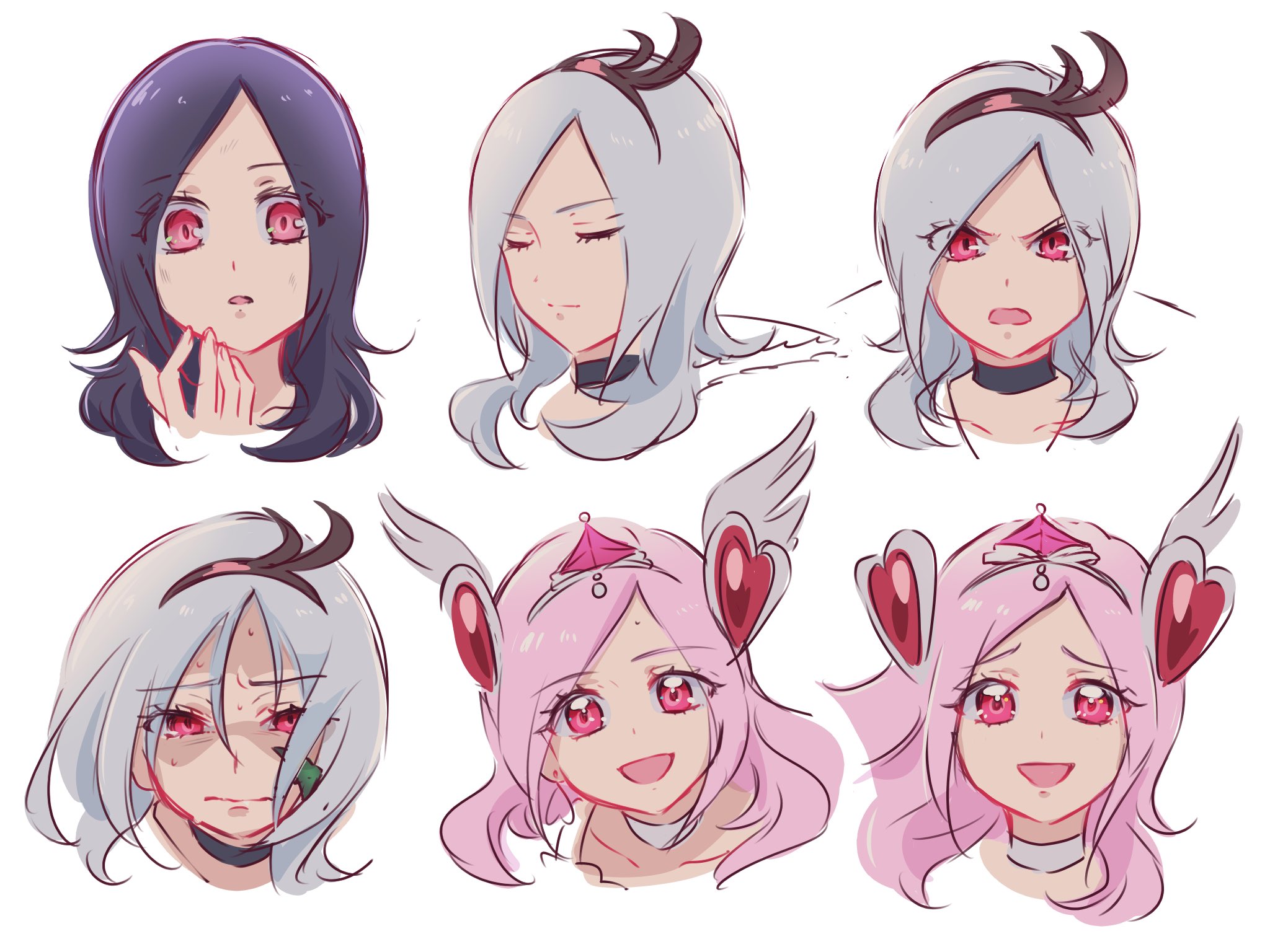 3girls black_choker black_hair black_hairband choker closed_mouth collarbone commentary_request cure_passion dirt dual_persona earrings eas_(precure) eyelashes fingernails fpminnie1 fresh_precure! gem hair_ornament hairband hand_up head_only heart heart_earrings heart_hair_ornament higashi_setsuna high_collar highres jewelry leaning_forward light_frown long_hair multiple_girls open_mouth parted_lips pink_eyes pink_gem pink_hair plant precure raised_eyebrows red_eyes shaded_face sketch smile straight-on sweat tiara v-shaped_eyebrows vines wavy_mouth white_background white_choker white_hair white_hairband winged_heart