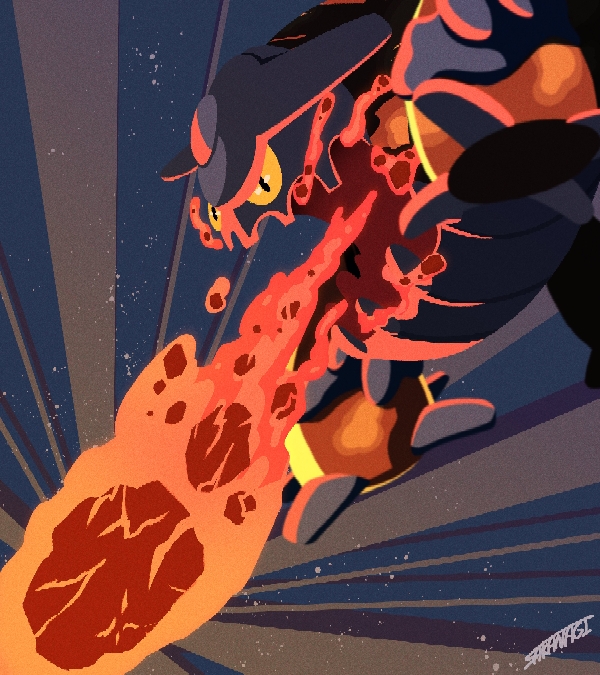 attack colored_sclera fire gen_4_pokemon heatran lava legendary_pokemon nintendo no_humans open_mouth pokemon pokemon_(creature) red_eyes red_sclera sakanagi_(a_r_co) solo