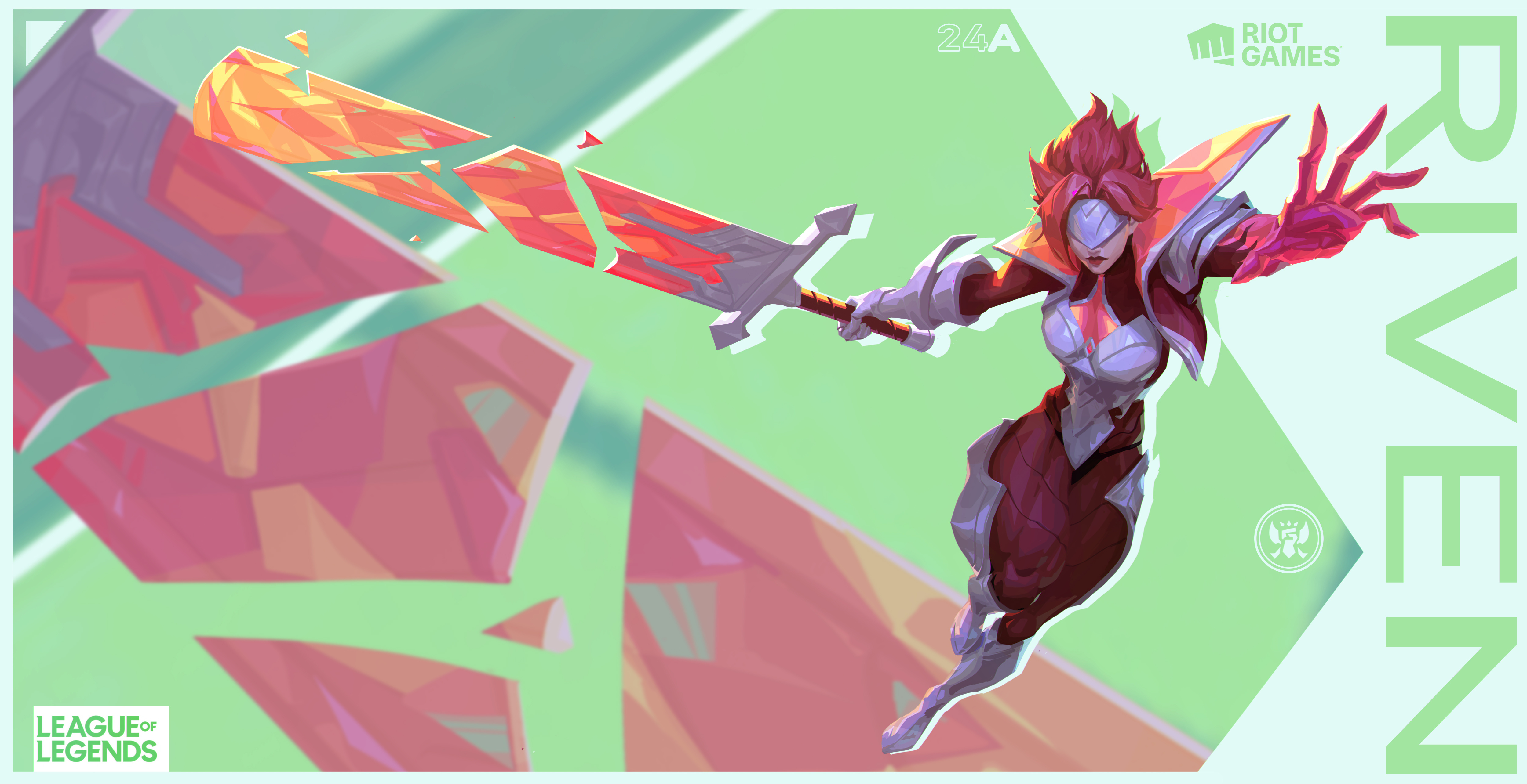 1girl 24a_(ershisiai) absurdres armor breasts broken broken_covenant_riven broken_sword broken_weapon character_name copyright_name facing_viewer full_body gloves green_background highres jacket large_breasts league_of_legends official_alternate_costume official_alternate_hairstyle open_clothes open_jacket pants red_gloves red_hair red_pants riven_(league_of_legends) short_hair solo sword weapon white_background