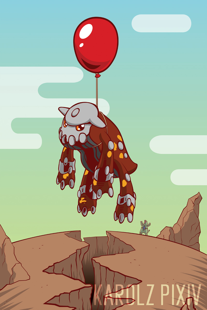 2others air_balloon_(pokemon) arms_up artist_name claws colored_sclera earth_(ornament) fire floating floating_object gameplay_mechanics gen_2_pokemon gen_4_pokemon heatran highres horns karolz legendary_pokemon looking_afar looking_at_another multiple_others nintendo no_humans open_mouth pokemon pokemon_(creature) red_eyes red_sclera sky standing tail tyranitar