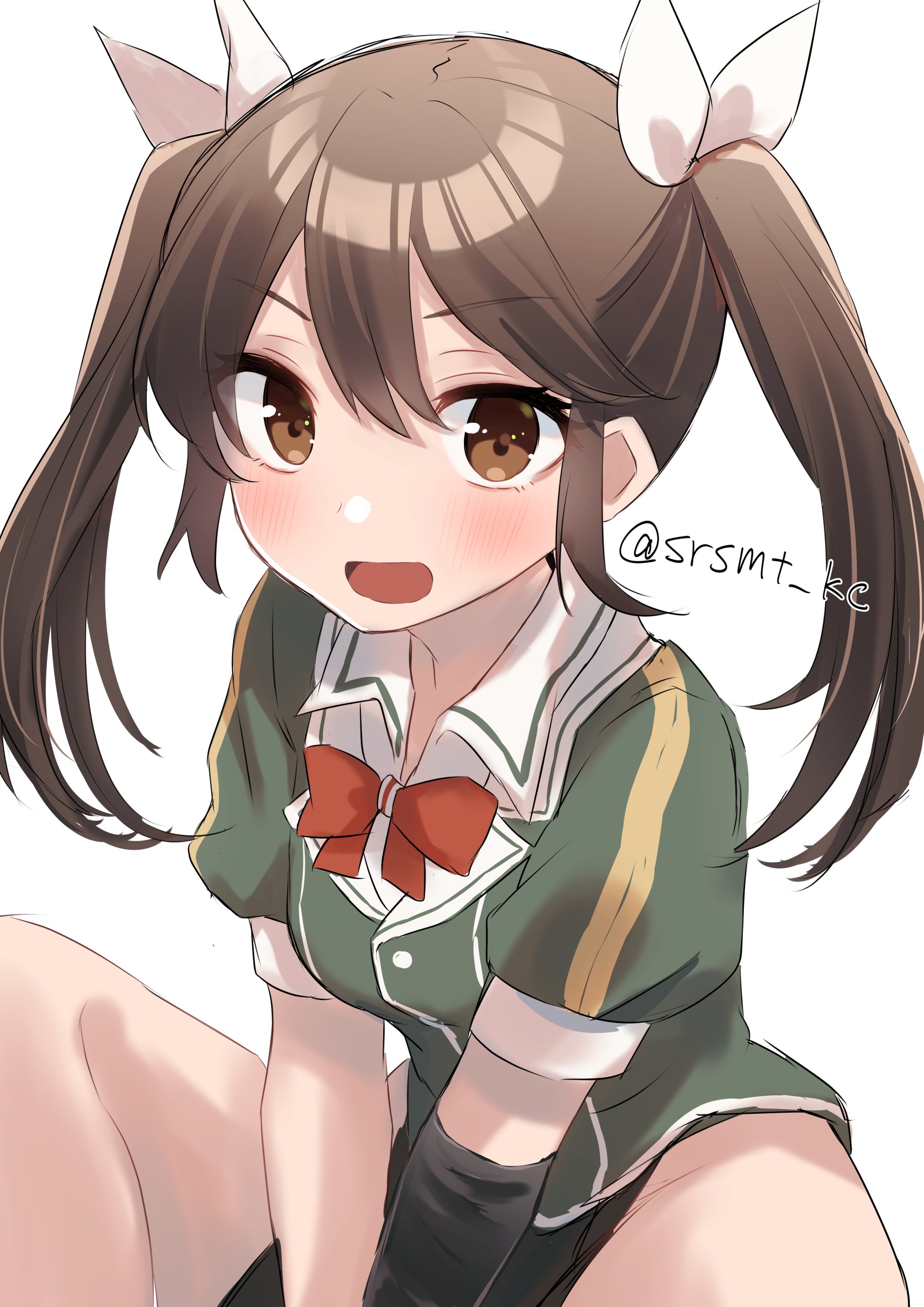 1girl absurdres blush brown_eyes brown_hair elbow_gloves gloves green_jacket hair_between_eyes hair_ribbon highres jacket kantai_collection long_hair looking_at_viewer military_uniform one-hour_drawing_challenge open_mouth pelvic_curtain ribbon shirasumato short_sleeves simple_background single_elbow_glove smile solo tone_(kancolle) twintails twitter_username white_background white_ribbon