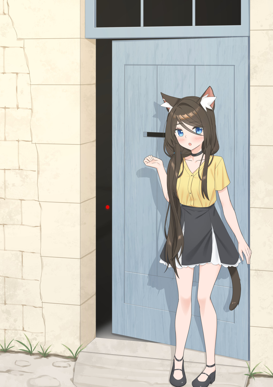 1girl aina_(mao_lian) animal_ear_fluff animal_ears black_skirt blue_eyes blush breasts brown_hair building cat_ears cat_tail commentary_request dark_room day full_body glowing glowing_eye highres long_hair looking_at_viewer low_twintails mao_lian_(nekokao) mary_janes no_socks open_door open_mouth original outdoors shadow shirt shoes short_sleeves skirt small_breasts sunlight tail twintails yellow_shirt
