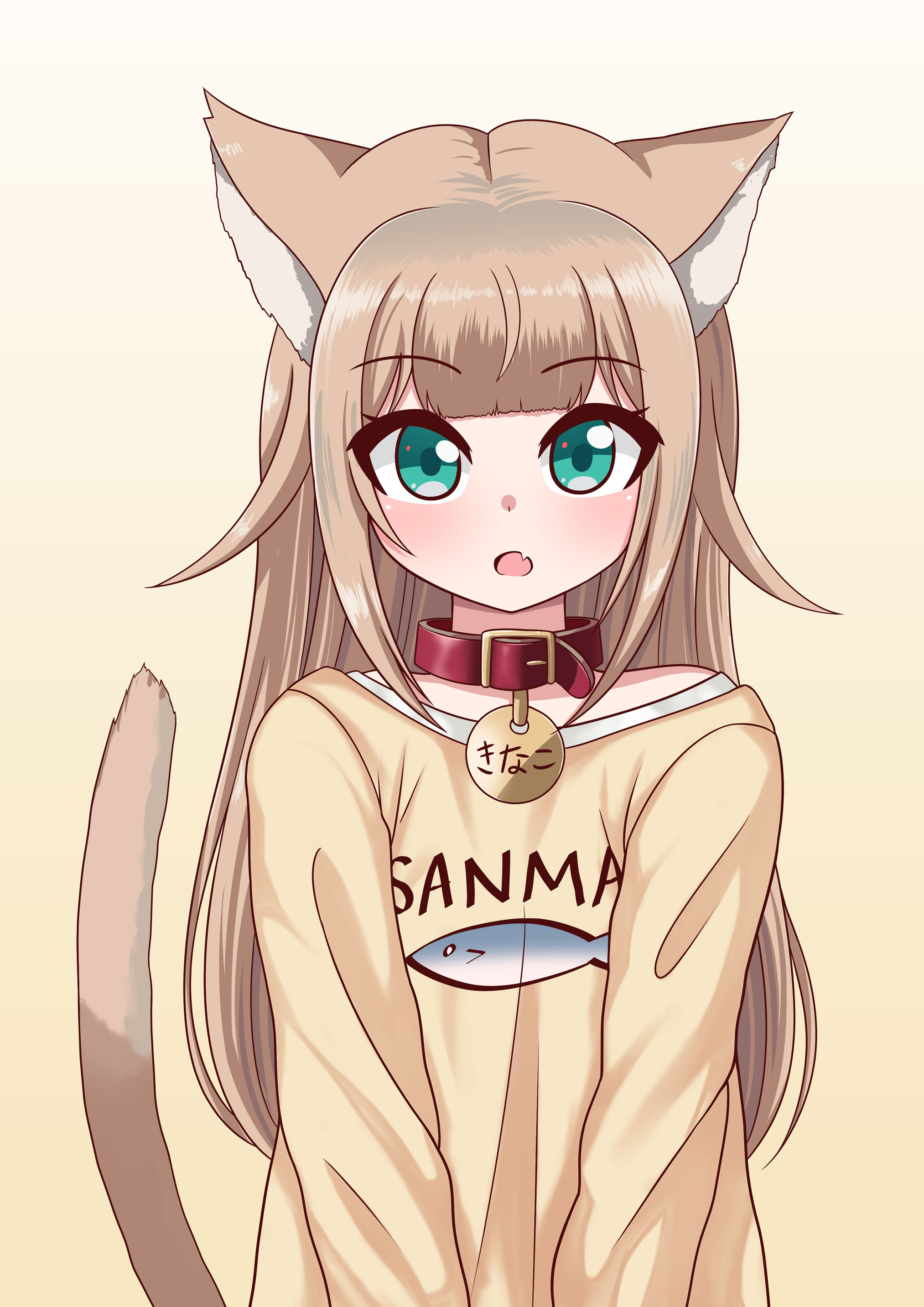 1girl :o absurdres animal_collar animal_ears blunt_bangs blush borrowed_character cat_ears cat_girl collar fang gradient_background green_eyes highres kinako_(40hara) long_hair looking_at_viewer original red_collar shirt skin_fang solo straight-on the_only_shoe upper_body white_background yellow_background yellow_shirt