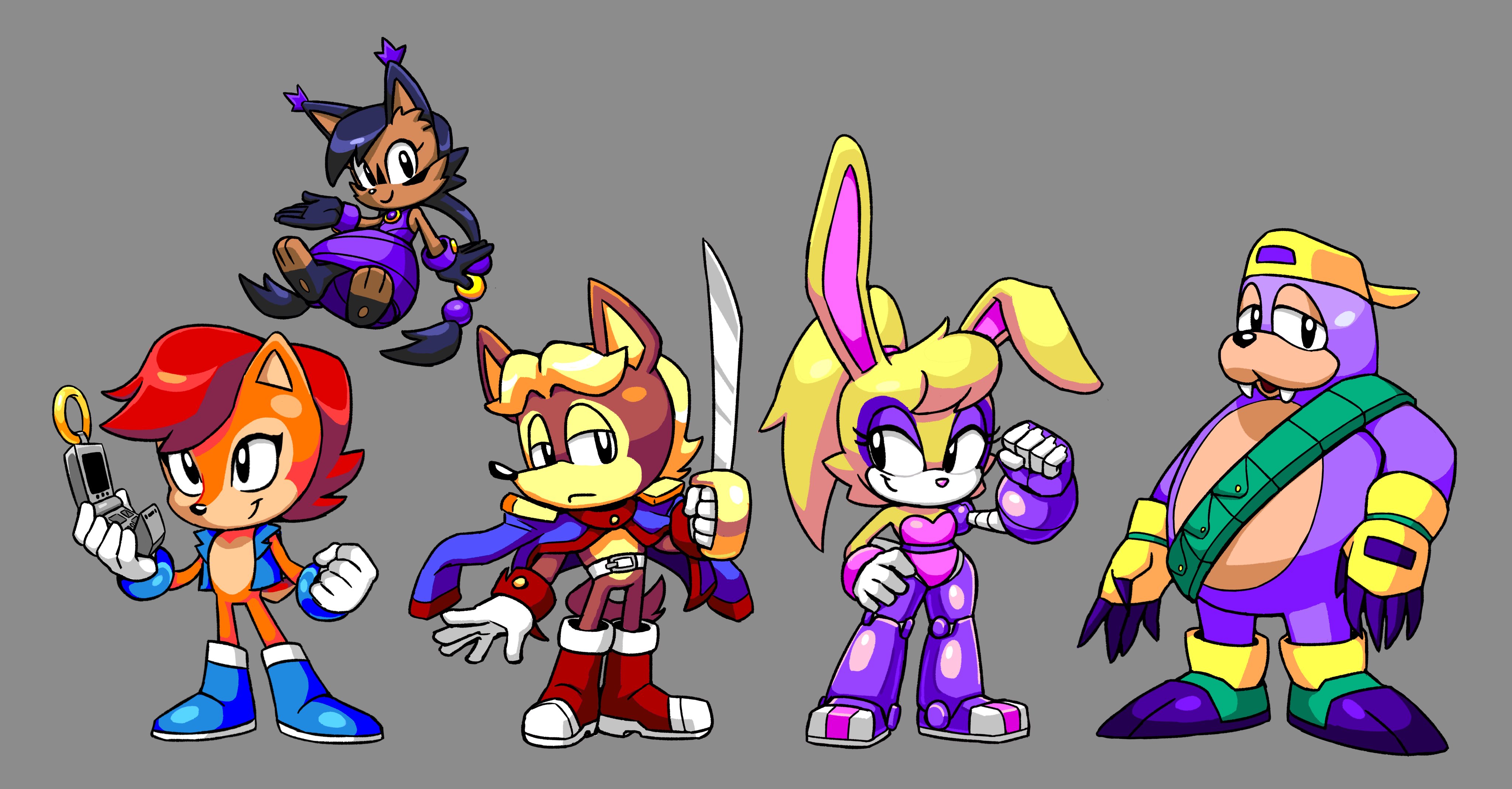 2boys 3girls absurdres animal_ears antoine_d'coolette blonde_hair bunnie_rabbot chipmunk_girl highres jacket multiple_boys multiple_girls nicole_(sonic) nicole_the_holo-lynx ponytail rabbit_ears rabbit_girl red_hair rotor_the_walrus sally_acorn sonic_(series) sonic_the_hedgehog_(classic) sword thepinkgalaxy weapon