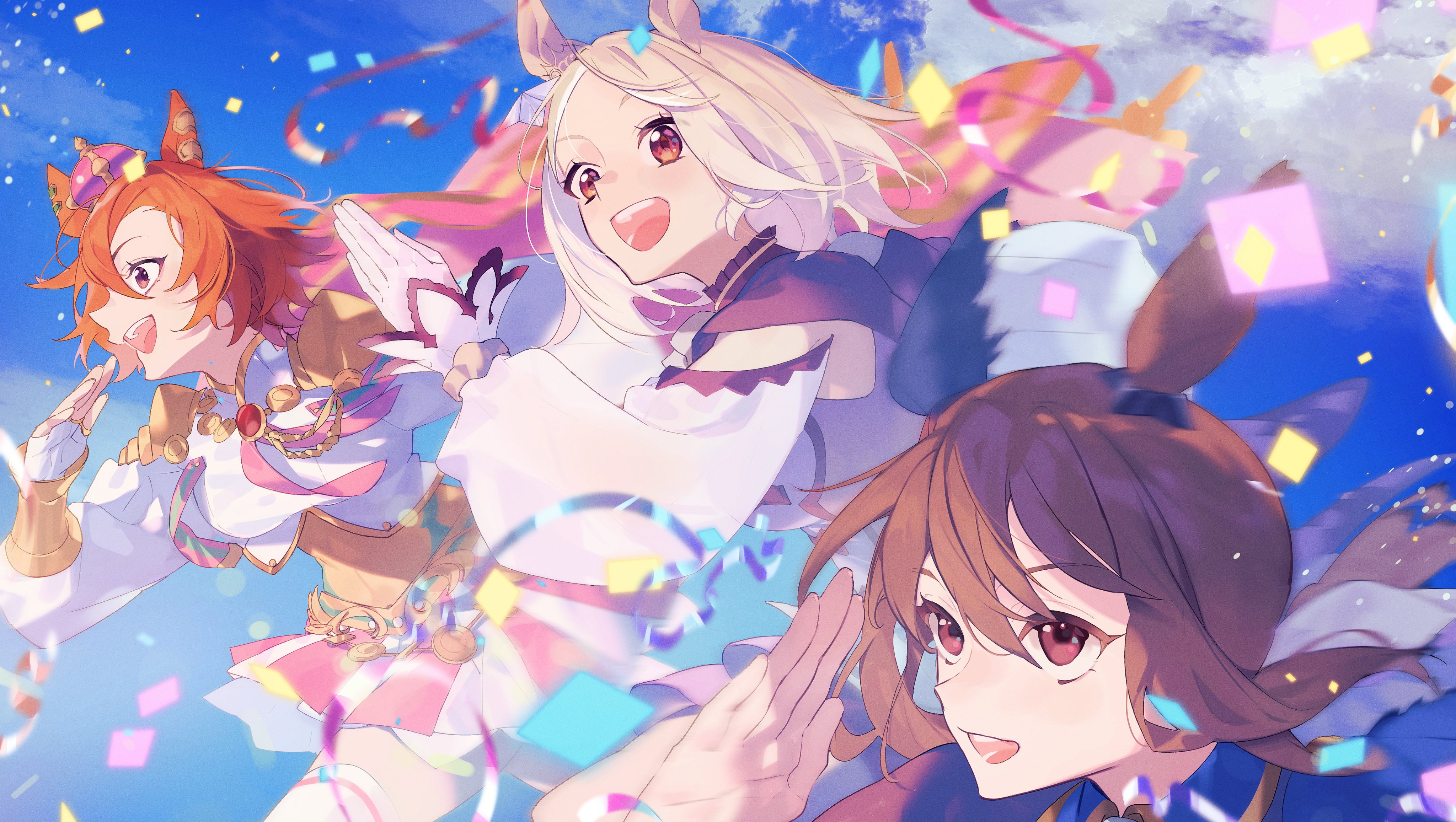 3girls absurdres admire_vega_(umamusume) animal_ears armor blonde_hair breasts brown_hair cloud confetti corset crown day detached_sleeves fingerless_gloves gloves highres horse_ears jacket mini_crown miniskirt motion_blur multiple_girls narita_top_road_(umamusume) open_mouth orange_eyes orange_hair outdoors purple_eyes purple_jacket running sava_(sava_023) shirt short_hair shoulder_armor skirt small_breasts smile streamers t.m._opera_o_(umamusume) umamusume umamusume:_road_to_the_top white_gloves white_shirt