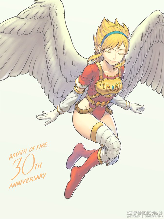 1girl blonde_hair breath_of_fire closed_eyes english_text gofelem leotard nina_(breath_of_fire_i) red_leotard wings