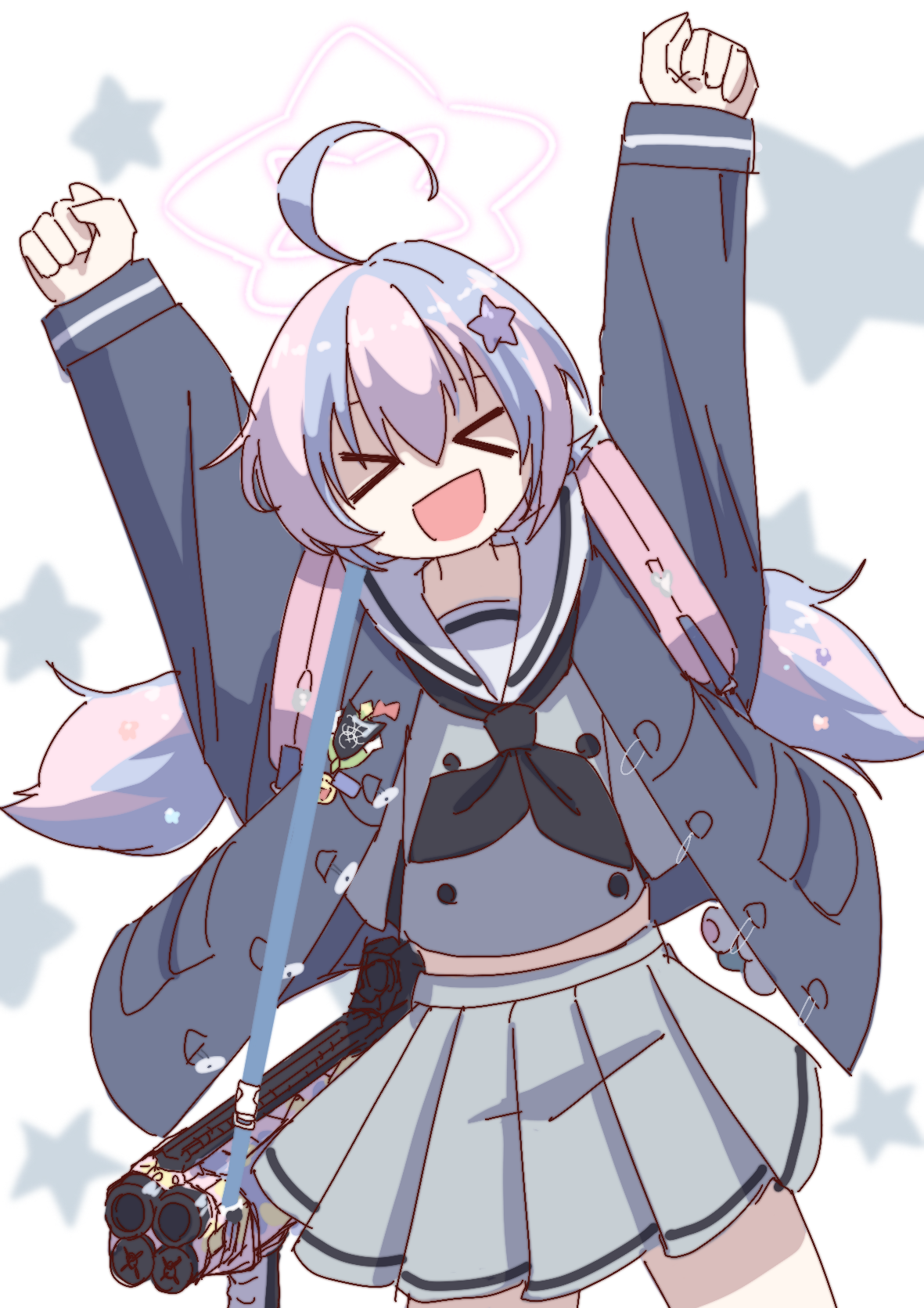 >_< 1girl :d ahoge backpack bag black_jacket black_neckerchief blue_archive blue_hair bullpup closed_eyes double-barreled_shotgun eyebrows_hidden_by_hair facing_viewer grey_serafuku grey_shirt grey_skirt gun hair_between_eyes hair_ornament halo highres jacket long_hair long_sleeves low_twintails multicolored_hair multiple-barrel_gun neckerchief open_clothes open_jacket open_mouth pink_hair pleated_skirt pump-action_shotgun pump_action reisa_(blue_archive) sailor_collar school_uniform serafuku shirt shotgun side-by-side-barreled_shotgun simple_background skirt sleeves_past_wrists smile solo standard_manufacturing_dp-12 star_(symbol) star_hair_ornament star_symbol_background twintails two-tone_hair unadon_(unadoom) very_long_hair weapon white_background white_sailor_collar xd