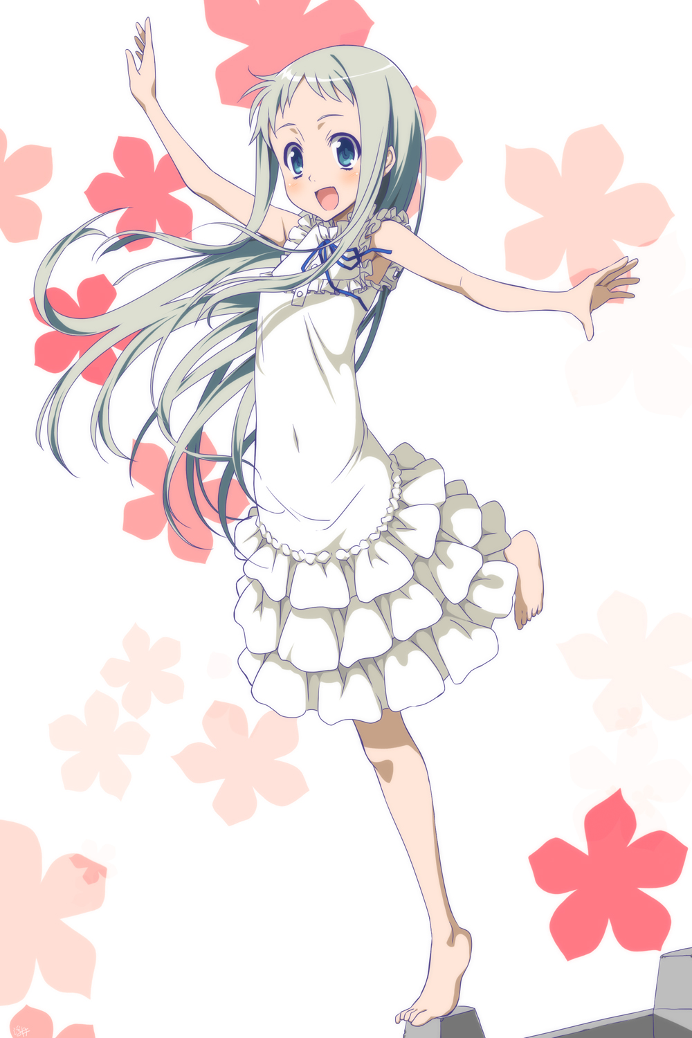 1girl ano_hi_mita_hana_no_namae_wo_bokutachi_wa_mada_shiranai. barefoot blue_eyes blue_ribbon blush dot_nose dress floral_background fugetsu_taku grey_hair highres honma_meiko long_hair looking_at_viewer neck_ribbon open_mouth ribbon sleeveless sleeveless_dress smile solo standing standing_on_one_leg white_background white_dress