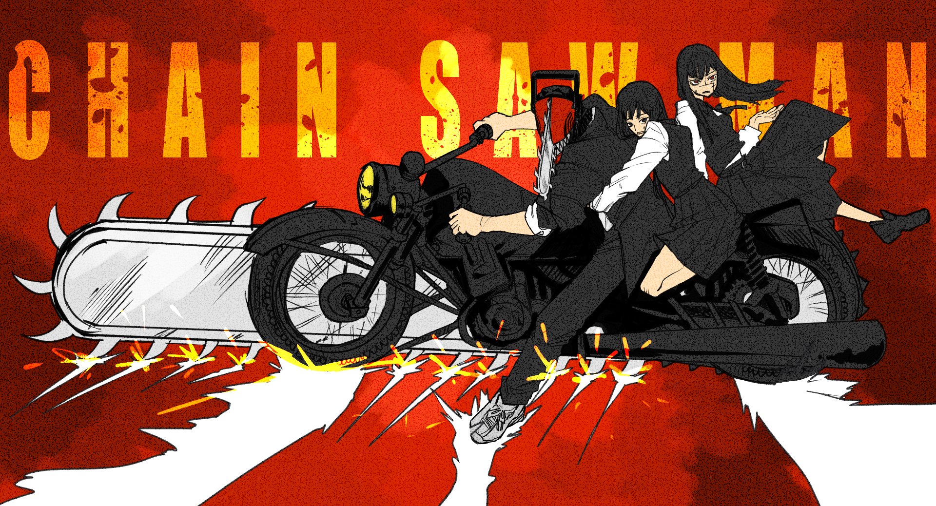 1boy 2girls akira_(manga) akira_slide black_hair black_pants chainsaw chainsaw_man collared_shirt denji_(chainsaw_man) fourth_east_high_school_uniform highres holding jacket long_hair long_sleeves mitaka_asa monster_boy motor_vehicle motorcycle multiple_girls multiple_riders on_motorcycle pants parody riding school_uniform sharp_teeth shirt short_hair sitting sleeves_rolled_up suichoku_(suityoku_conpas) teeth white_shirt yoru_(chainsaw_man)