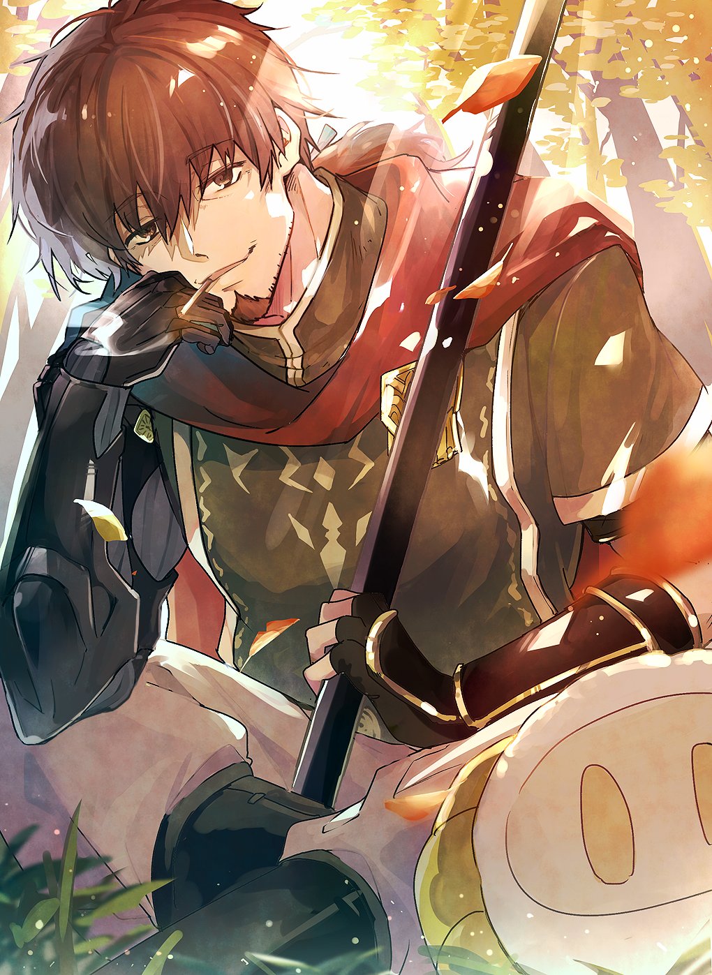 1boy apollo_(fate) brown_eyes brown_hair cape facial_hair falling_leaves fate/grand_order fate_(series) forest gauntlets goatee grass green_shirt green_tabard hair_ribbon hector_(fate) highres holding holding_polearm holding_weapon indian_style leaf looking_at_viewer male_focus mature_male mouth_hold nature outdoors polearm ponytail red_cape ribbon shirt short_sleeves sitting smoke smoking sparse_stubble tabard tree tumikilondon5 weapon