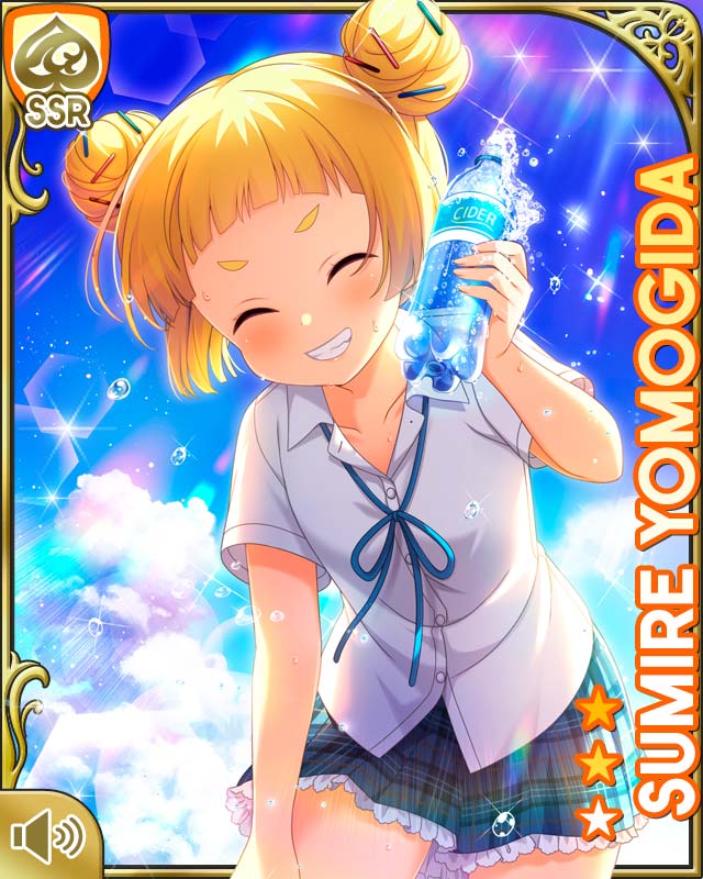 1girl bare_legs beach blonde_hair blue_neckwear blue_skirt bottle card_(medium) character_name closed_eyes closed_mouth day double_bun girlfriend_(kari) hair_bun ocean official_art outdoors petticoat plaid_clothes plaid_skirt purple_eyes qp:flapper school_uniform shirt skirt smile solo standing tagme teeth wading water_bottle white_shirt yomogida_sumire