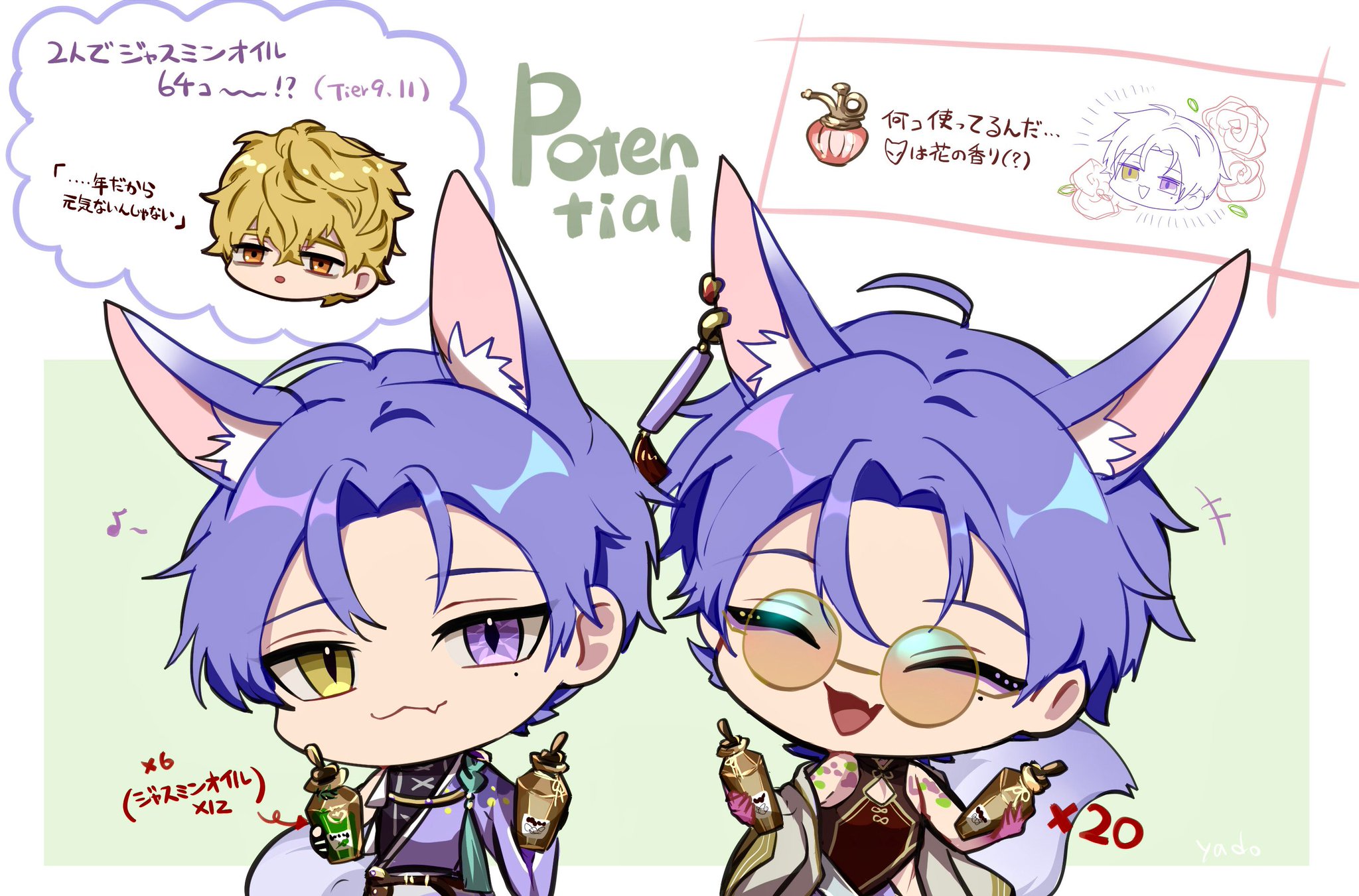 3boys ahoge animal_ear_fluff animal_ears bags_under_eyes blonde_hair bottle cat_smile chibi closed_eyes closed_mouth blonde_hair earrings ears_up eyeliner fang fox_boy fox_ears glasses happy heterochromia highres holding holding_bottle holding jewelry kuya_(nu_carnival) makeup male_focus messy_hair mole mole_under_eye multiple_boys multiple_persona musical_note nu_carnival open_mouth orange_eyes purple_eyes purple_hair quincy_(nu_carnival) short_hair skin_fang slit_pupils smile upper_body yadome810 yellow_eyes