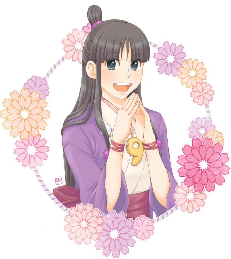 1girl :d ace_attorney black_hair floral_background hair_ornament half_updo hands_up hiraishi_wataru japanese_clothes jewelry kimono long_hair looking_at_viewer magatama maya_fey open_mouth own_hands_together parted_bangs smile solo sphere_hair_ornament upper_body white_background