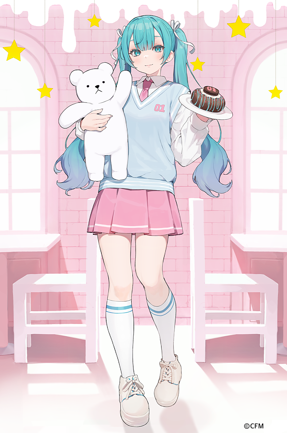 1girl aqua_eyes aqua_hair artist_name blue_hair blue_sweater_vest blush chair closed_mouth collared_shirt commentary_request copyright_notice fingernails full_body gradient_hair hair_between_eyes hair_ribbon hamunezuko_(nezukonezu32) hatsune_miku highres holding holding_plate indoors kneehighs long_hair looking_at_viewer mint mint_chocolate multicolored_hair necktie partial_commentary pink_necktie pink_skirt plate pleated_skirt ribbon shadow shirt sidelocks skirt smile socks solo standing stuffed_animal stuffed_toy sweater_vest table teddy_bear twintails vocaloid white_footwear white_ribbon white_socks window