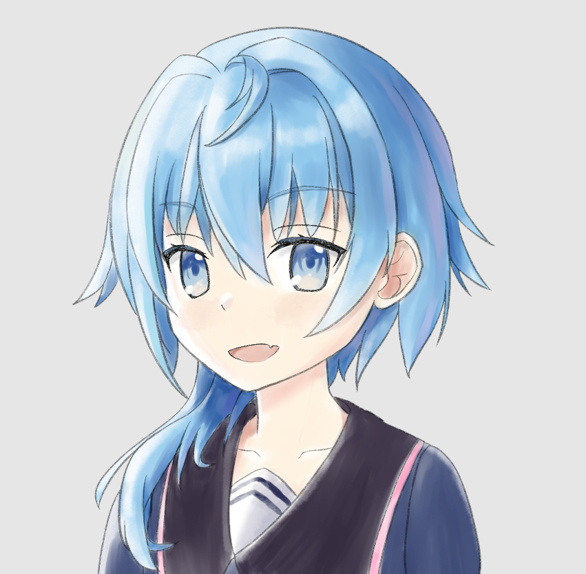 1girl asymmetrical_hair black_sailor_collar blue_eyes blue_hair blue_shirt fang grey_background kantai_collection kotou_yogen minazuki_(kancolle) open_mouth sailor_collar school_uniform serafuku shirt short_hair_with_long_locks simple_background skin_fang smile solo upper_body