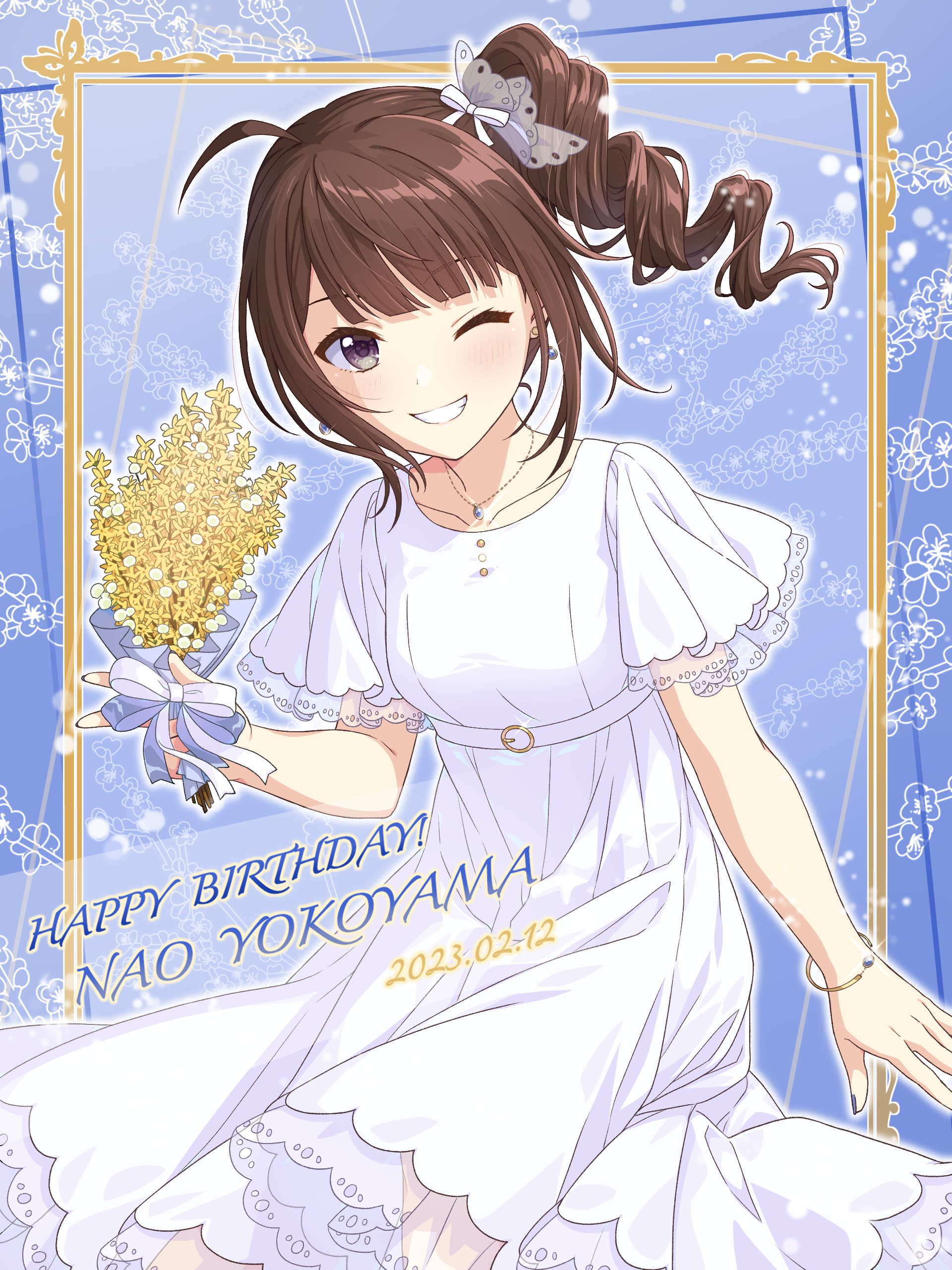 1girl 2023 absurdres ahoge blue_nails blunt_bangs blush bouquet bow bracelet breasts brown_hair character_name collarbone dress drill_hair earrings flower grin hair_ornament happy_birthday highres holding holding_bouquet idolmaster idolmaster_million_live! idolmaster_million_live!_theater_days jewelry long_hair looking_at_viewer applying_manicure medium_breasts nail_polish one_eye_closed purple_eyes ribbon see-through_clothes see-through_sleeves shiro_(ongrokm) short_sleeves side_drill side_ponytail sidelocks small_breasts smile solo white_dress yellow_flower yokoyama_nao