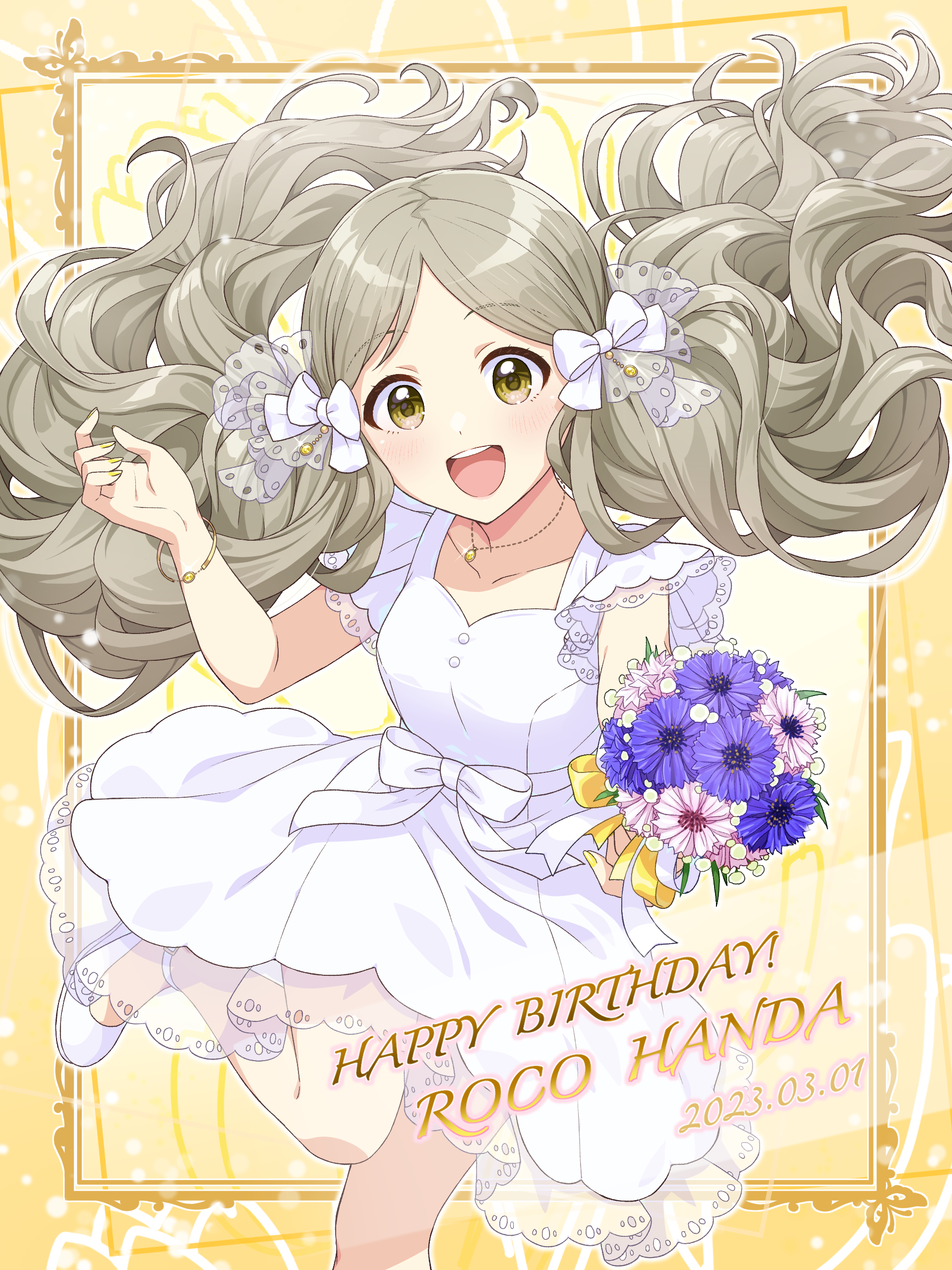 1girl 2023 absurdres applying_manicure blush bouquet bow bracelet breasts buttons character_name collarbone cornflower dot_nose dress flower grey_hair hair_bow hair_spread_out handa_roco happy_birthday highres holding holding_bouquet idolmaster idolmaster_million_live! idolmaster_million_live!_theater_days jewelry jumping long_hair looking_at_viewer nail_polish open_mouth pendant see-through_clothes see-through_sleeves shiro_(ongrokm) short_sleeves small_breasts smile solo teeth twintails upper_teeth_only very_long_hair white_dress white_footwear yellow_eyes yellow_nails