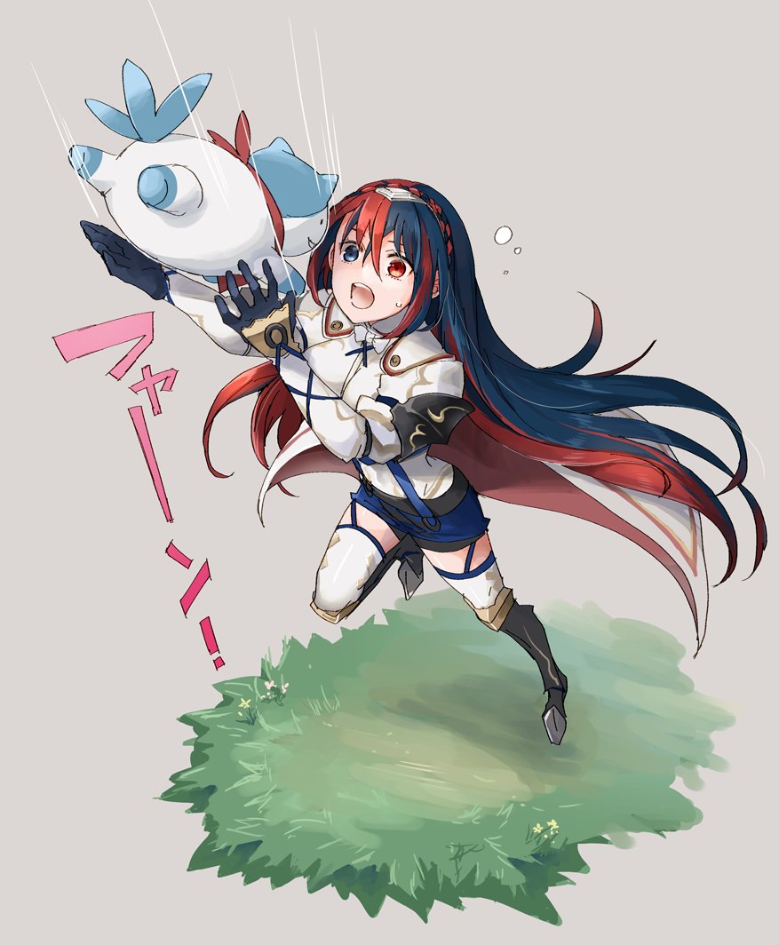 1girl female_alear_(fire_emblem) black_gloves blue_eyes blue_hair blue_skirt braid catching crown_braid fire_emblem fire_emblem_engage from_behind garter_straps gloves grey_background heterochromia long_hair multicolored_hair nintendo open_mouth red_eyes red_hair robaco skirt sommie_(fire_emblem) split-color_hair sweat thighhighs tiara very_long_hair