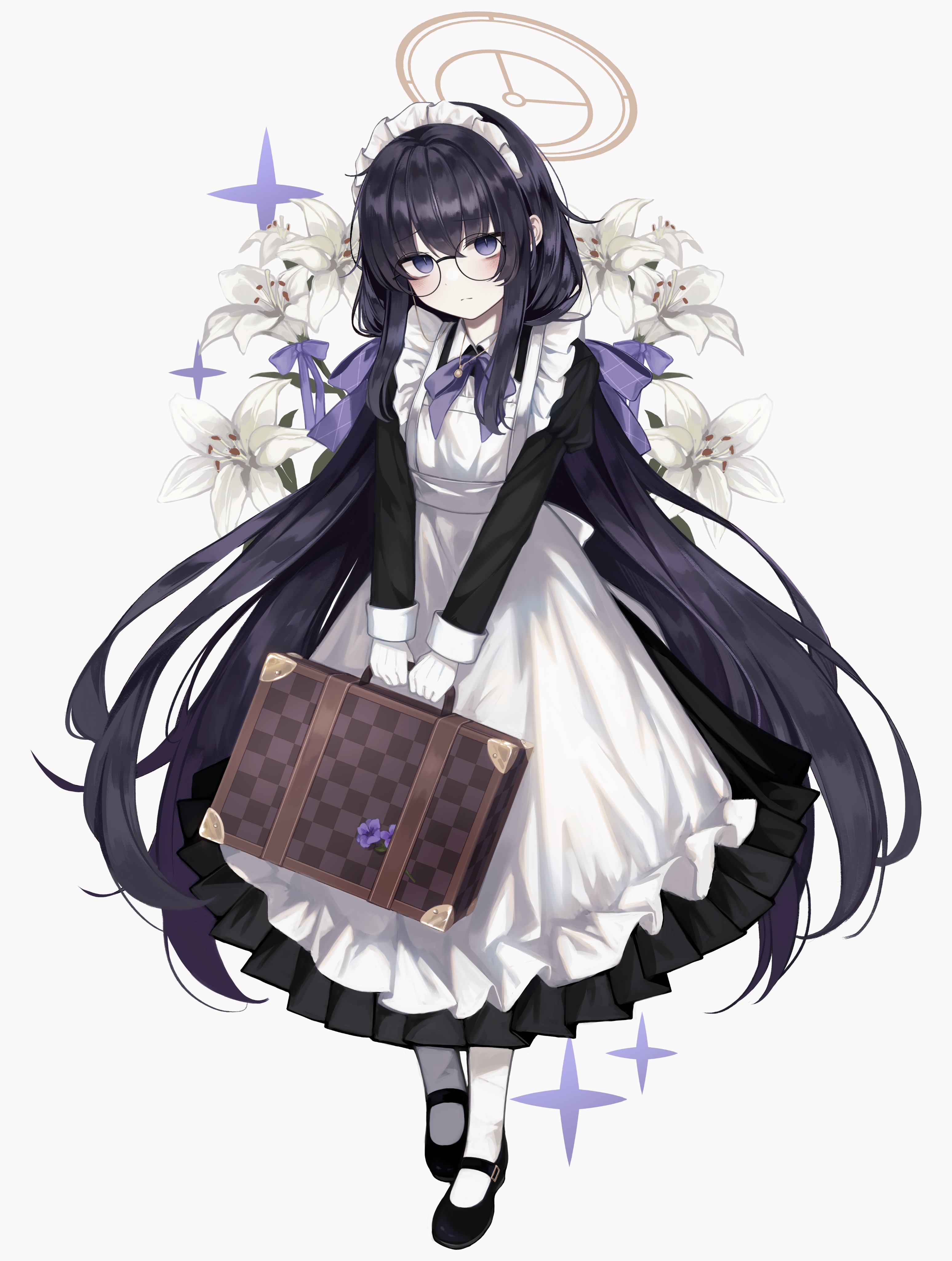 1girl absurdres alternate_costume apron bags_under_eyes black_dress black_hair black_shoes blue_archive bow bowtie closed_mouth dress enmaided expressionless floral_background flower full_body glasses gloves halo highres holding_case karou_(lhscck302) long_hair looking_back maid maid_apron maid_headdress mary_janes pantyhose purple_bow purple_bowtie purple_eyes shoes sidelocks simple_background solo sparkle standing ui_(blue_archive) very_long_hair white_apron white_flower white_gloves white_pantyhose